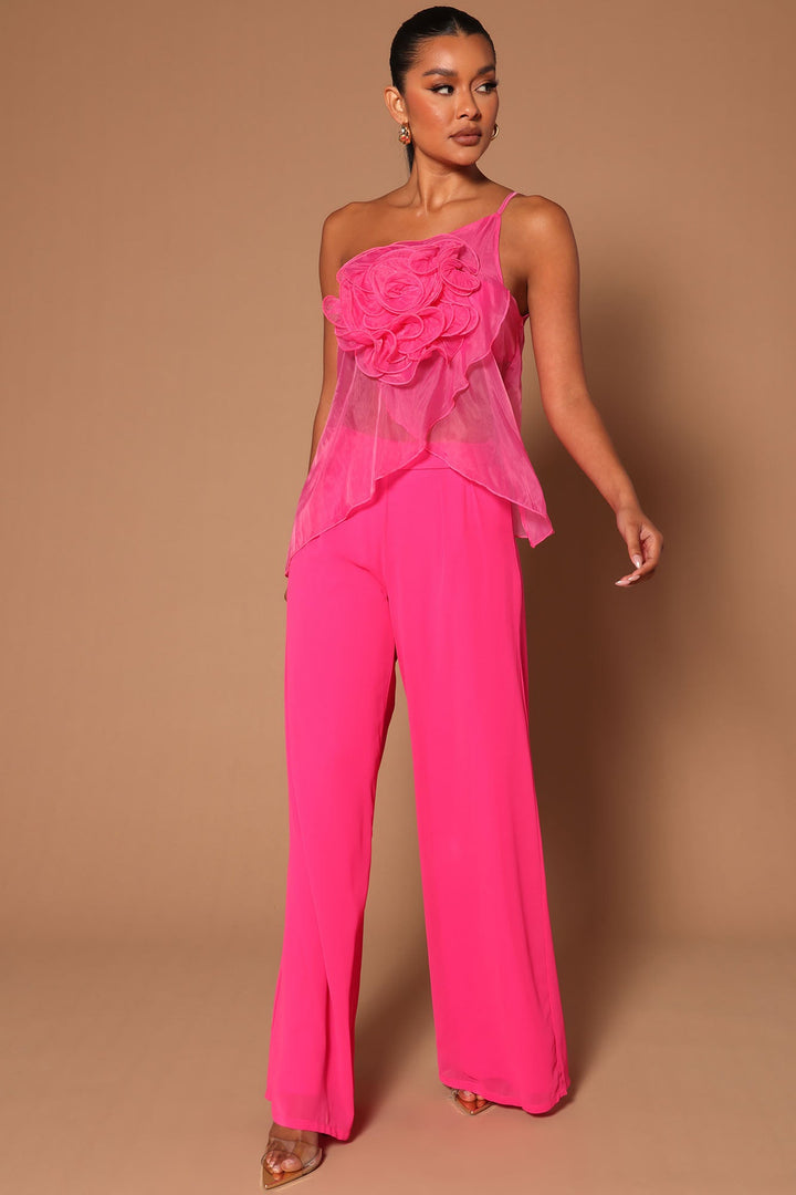 Available In Hot Pink. | Top | One Shoulder | Adjustable Spaghetti Straps | Padded Bra Cups w/ Underwire | Asymmetrical Hem | Oversized Flower Applique | Non Stretch | Shell: 100% Polyester | Lining: 100% Polyester | Imported