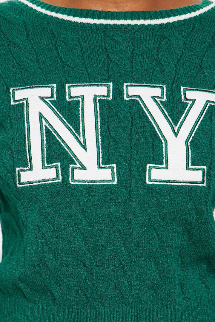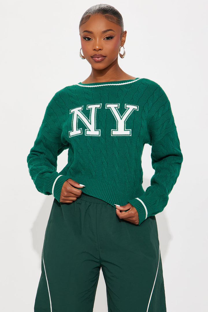 Available In Green/combo And Ivory/combo. | Pullover Sweater | NY Embroidered | Cable Knit Detail | 50% Rayon 28% Polyester 22% Nylon | Imported