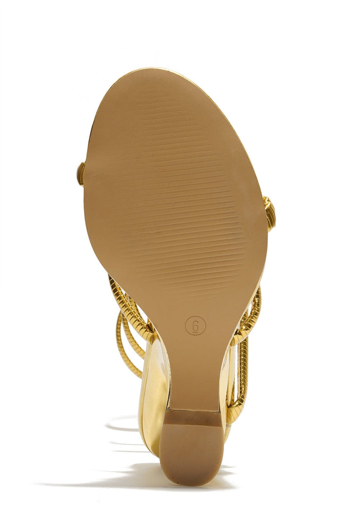 LARYSSA - GOLD - HEELS by CAPE ROBBIN Heel height: 4-inch Strappy wrap around PU Leather insole with memory foam Metallic finish Round toe Meet the Laryssa heels, featuring a striking spiral strap that wraps around your leg. These sandals are available in stunning gold, sleek black, vibrant blue, and shimmering silver. Perfect for the fearless fashionista who loves to stand out, the metallic finish adds a touch of luxury and sophistication, ensuring all eyes are on you. Whether you're heading to a party, a special event, or a night out, these sandals will ensure you make a bold fashion statement.
