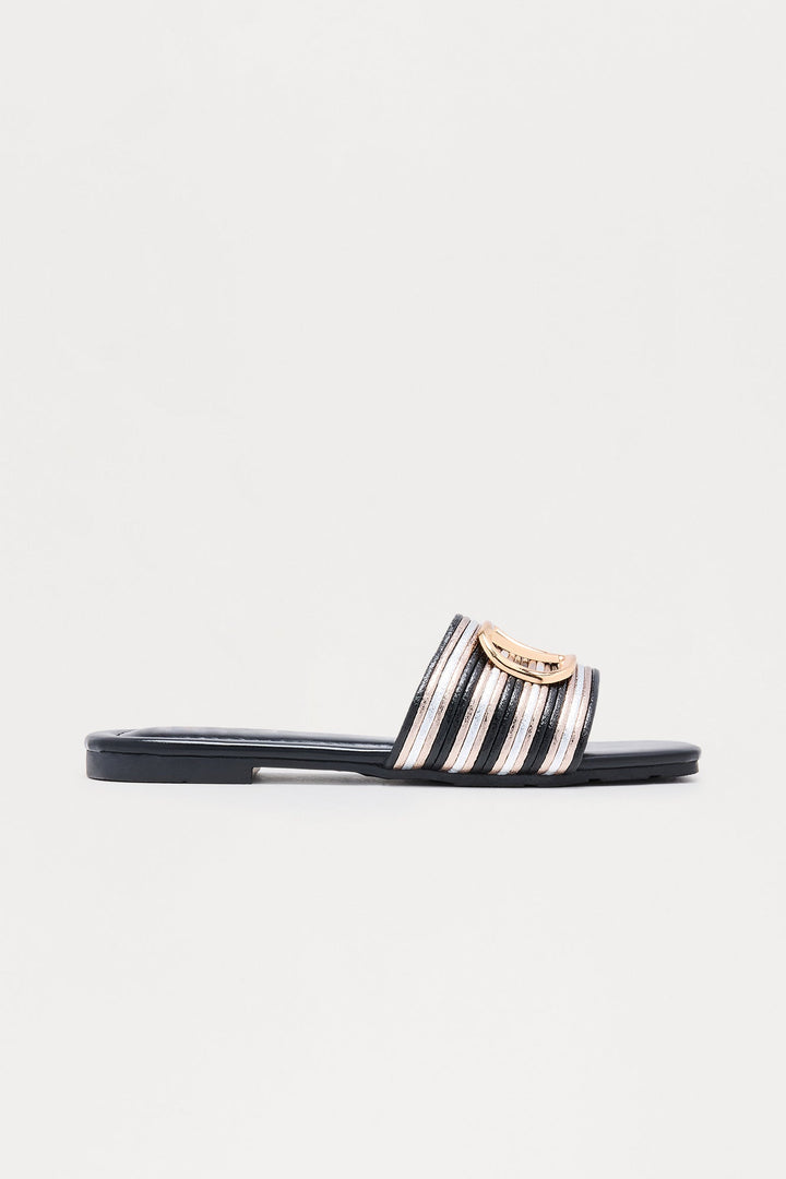 Available In Black, Gold And Pink. | Flat Sandals | Hardware Detail | Metallic Straps | Square Toe | Flat Heel | Imported