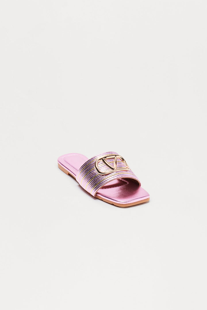 Available In Black, Gold And Pink. | Flat Sandals | Hardware Detail | Metallic Straps | Square Toe | Flat Heel | Imported