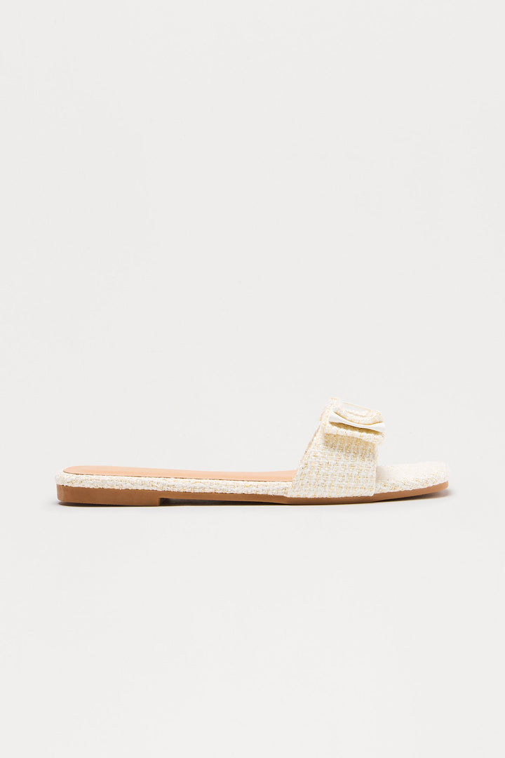 Available In Pink And White. | Flat Sandals | Tweed | Bow Detail | Round Toe | Flat Heel | Imported