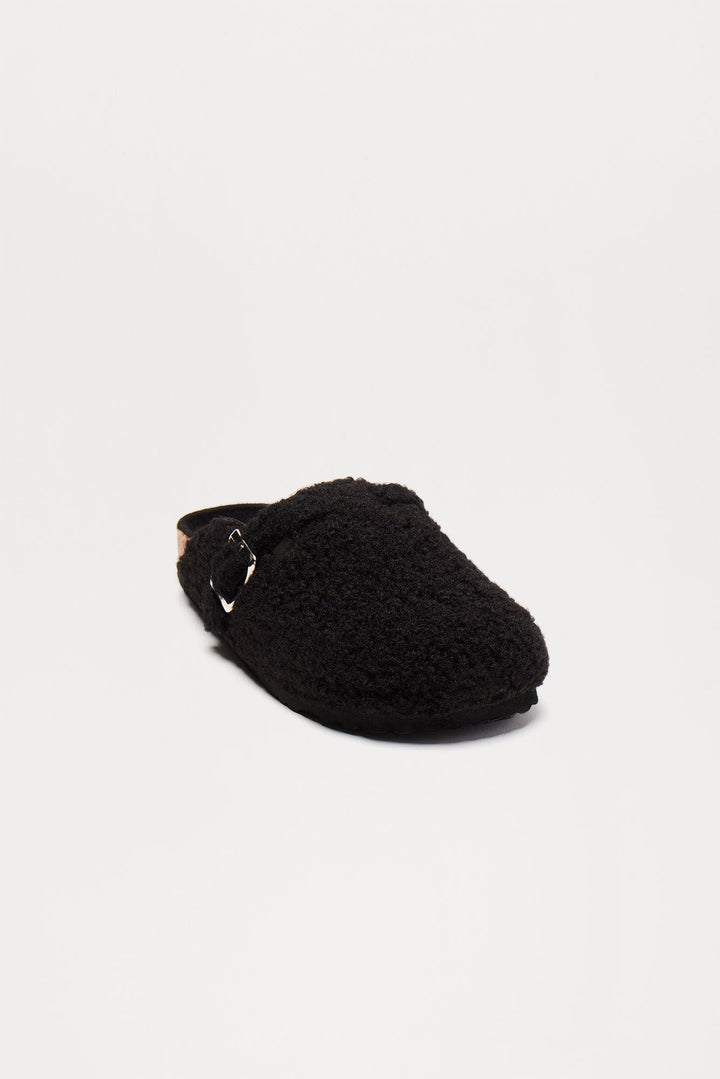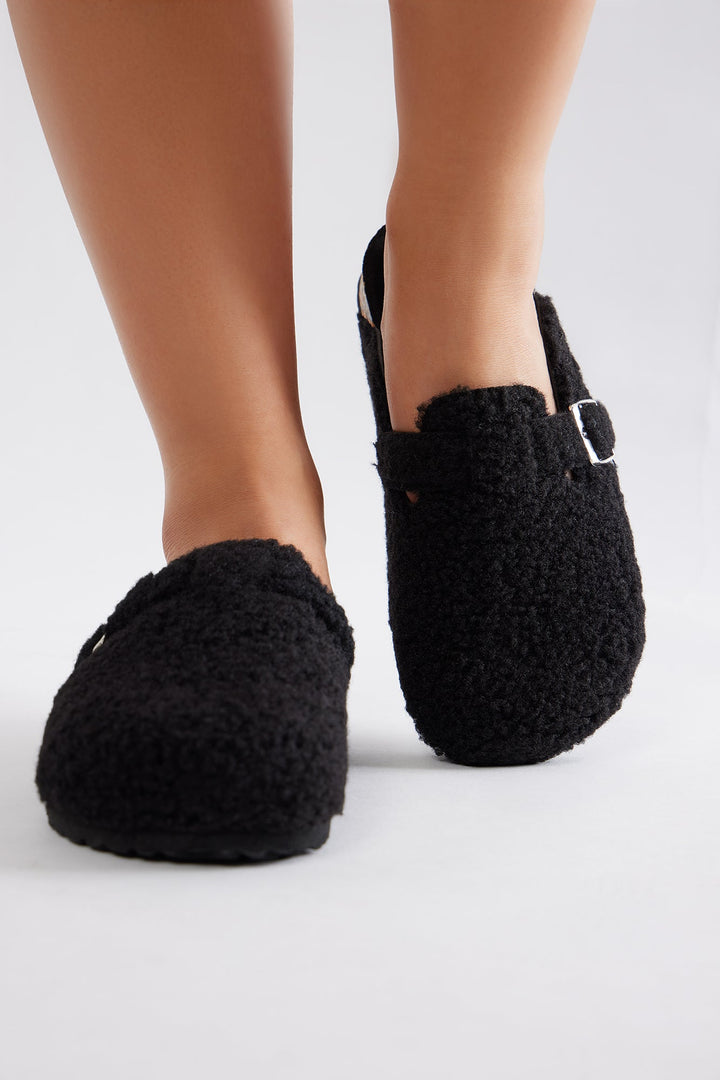 Available In Black. | Casual Slides | Sherpa | Buckle Detail | Round Toe | Flat Heel | Imported