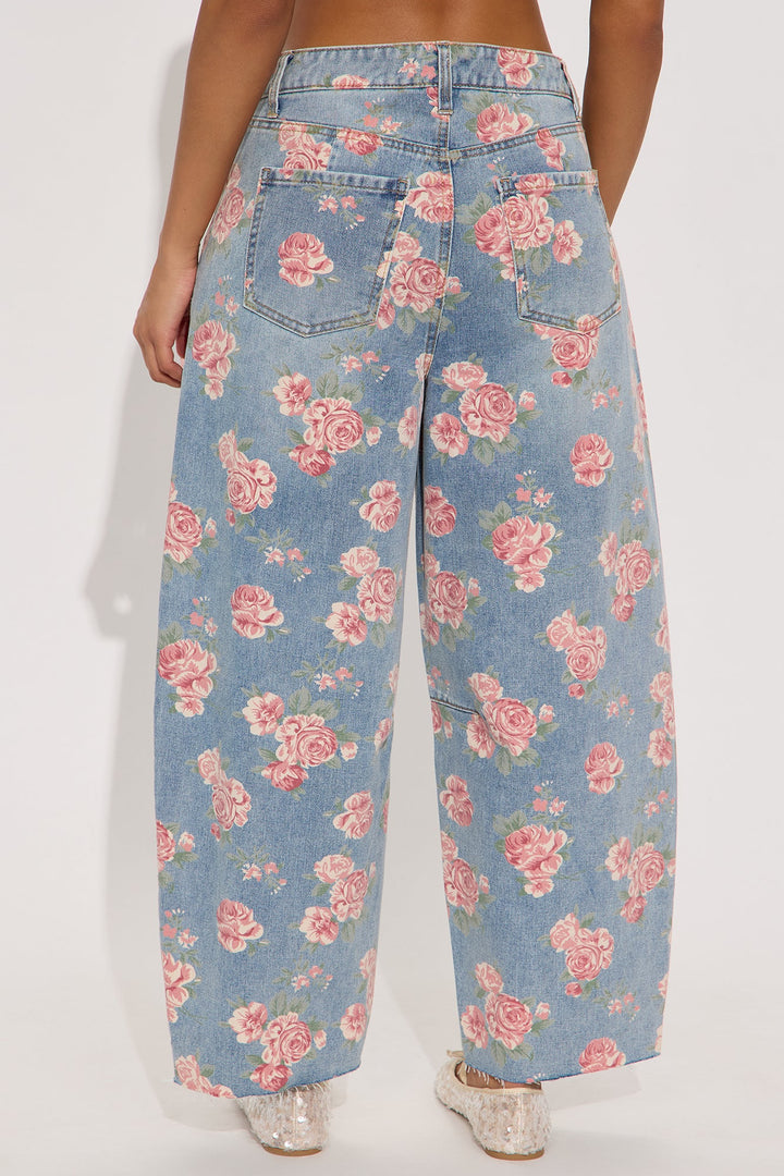 Available In Light Wash. | Barrel Jean | 5 Pocket | Floral Print | Raw Hem | 11" Rise | 25" Inseam | Self : 83% Cotton, 17% Polyester | Non Stretch | Imported