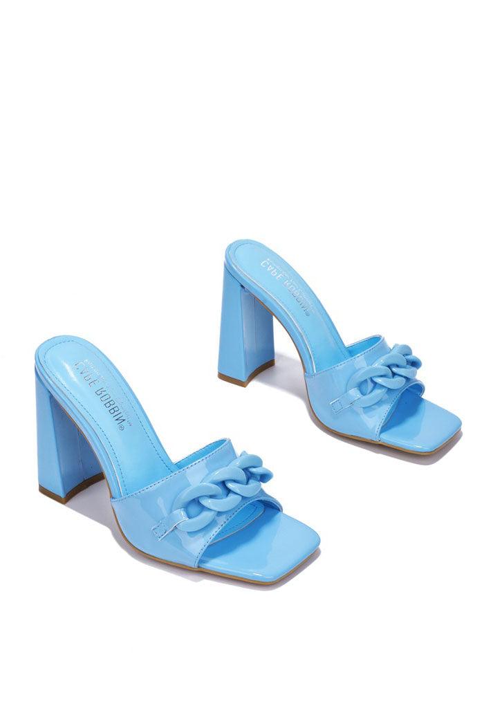 LETITA - BLUE - HEELS by CAPE ROBBIN square toe block heels chain trim padded insole Letita features a sleek and stylish silhouette that's perfect for any occasion. The heels give a modern feel,while the chain trim offers a dash of style. This shoe is sure to be both fashionable and comfortable,making it a great addition to any collection. Comes in brown,blue,and mauve.