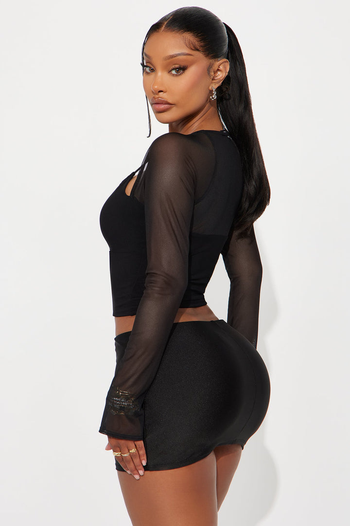 Available In Black. | Corset Top | Mesh Long Sleeve | Cut Out | Ruched | Boning | Stretch | Self/Contrast: 95% Polyester 5% Spandex | Imported
