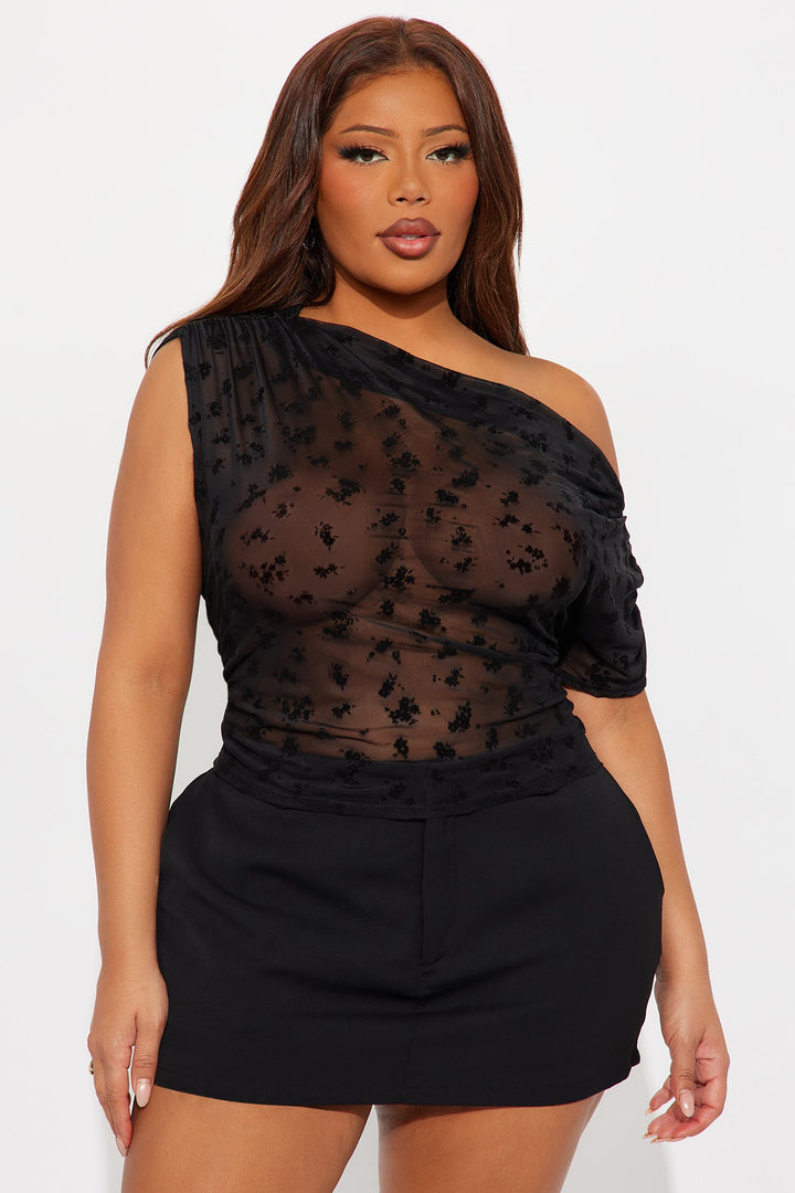 Available In Black/combo. | Flocked Top | Off Shoulder | Ruched | Mesh | Stretch | Self: 90% Polyester 10% Spandex | Imported