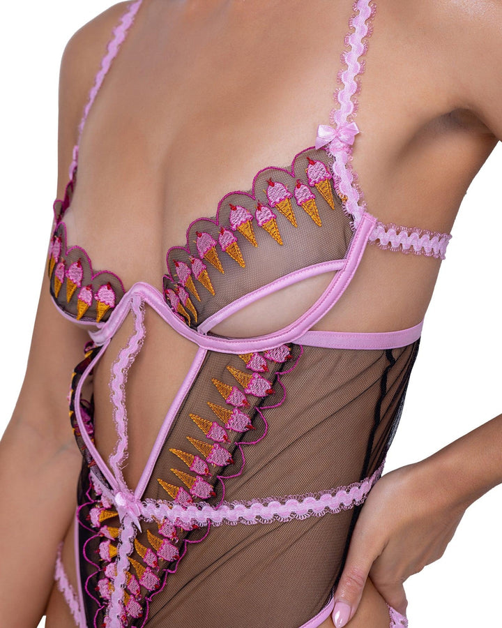 Strawberry Sherbet Teddy Teddy: - Ice Cream embroidered illusion tulle - Satin ribbon bow detail - Demi cup with cut-out & underwire - Hook & eye closure - Cotton gusset