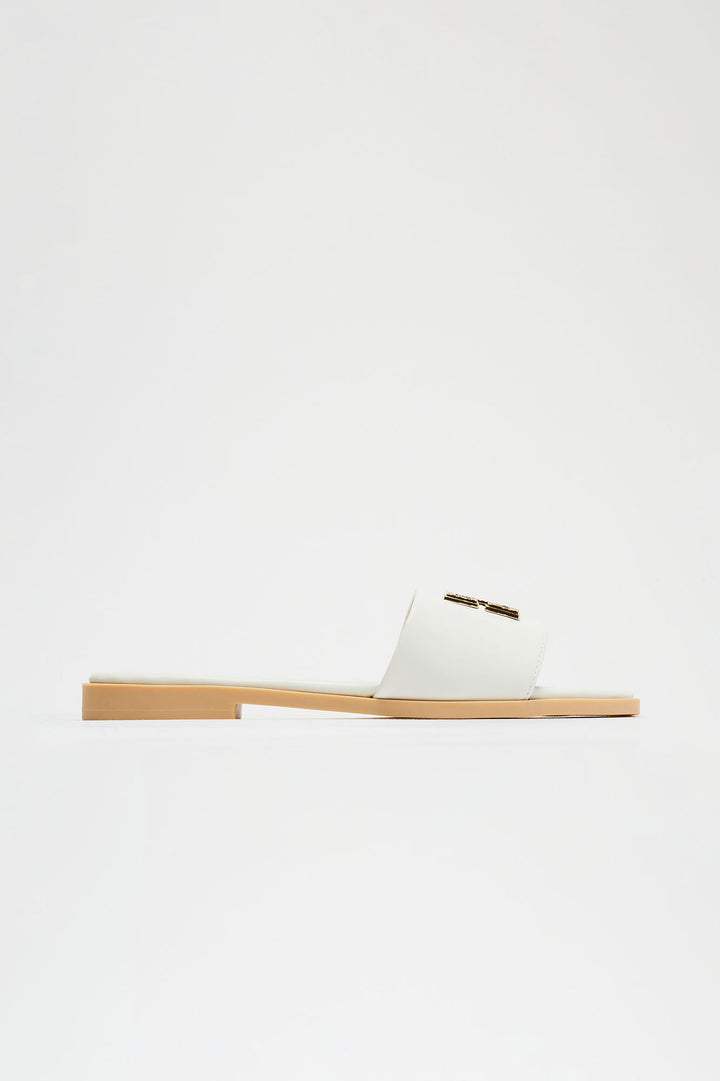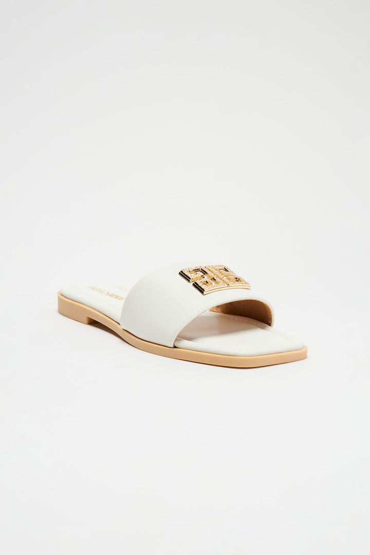 Available In Black, Camel, Gold, Leopard And White. | Flat Sandals | Hardware Detail | Square Toe | Flat Heel | Imported