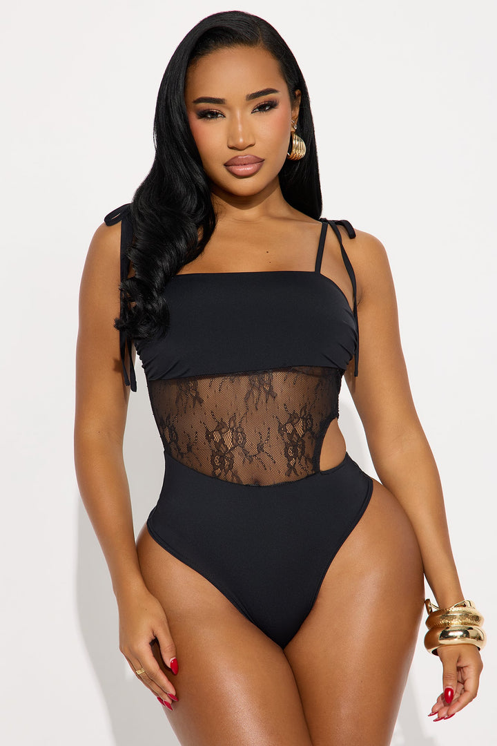 Available In Black. | Bodysuit | Stretch | Tie Shoulders | Lace Cut Out | Cheeky Bottom | Snap Closure | Final Sale | Self: 85% Nylon 15% Spandex | Contrast: 90% Nylon 10% Spandex | Lining: 85% Nylon 15% Spandex | Imported