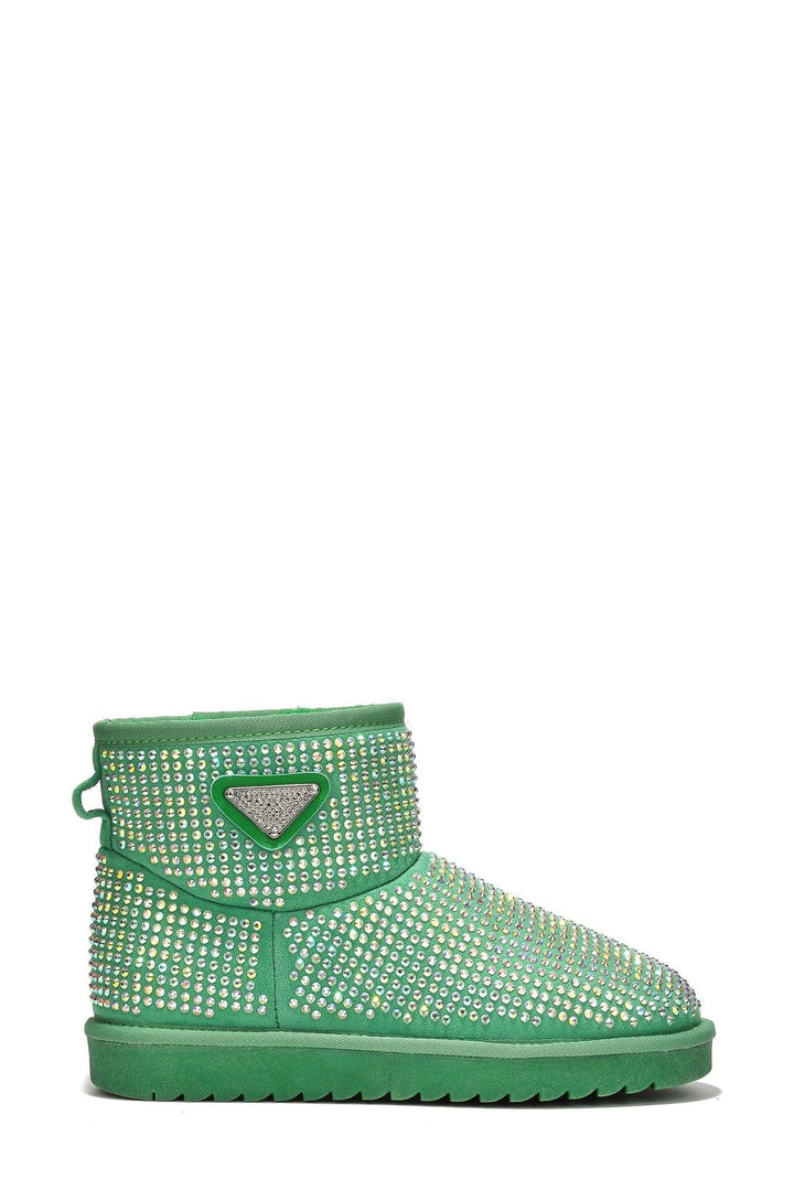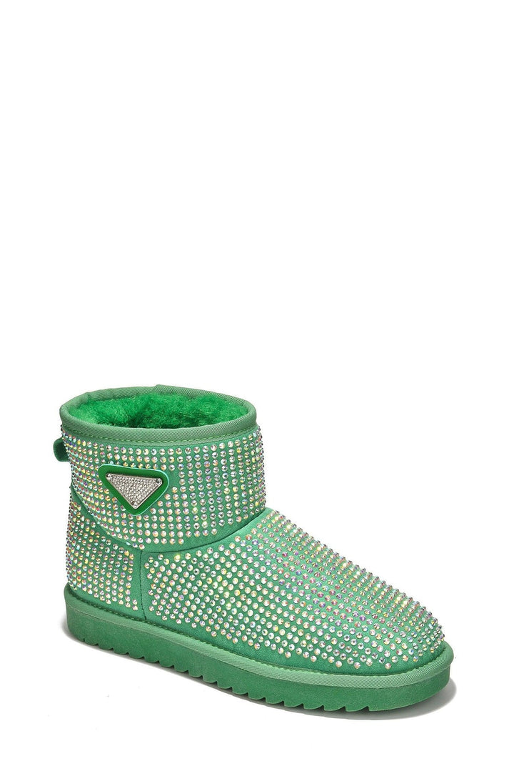 LINDAK - GREEN - BOOTIES by CAPE ROBBIN round toe suede finish pull tab rhinestone embellishment fur-lined lug sole Look effortlessly stylish and comfy in these Lindak ankle booties! Features premium suede material for an elegant finish,rhinestone accented for a shimmering vibe all day and night,and fur-lined interior for a cozy feel. Comes in black,blue,green,or silver.