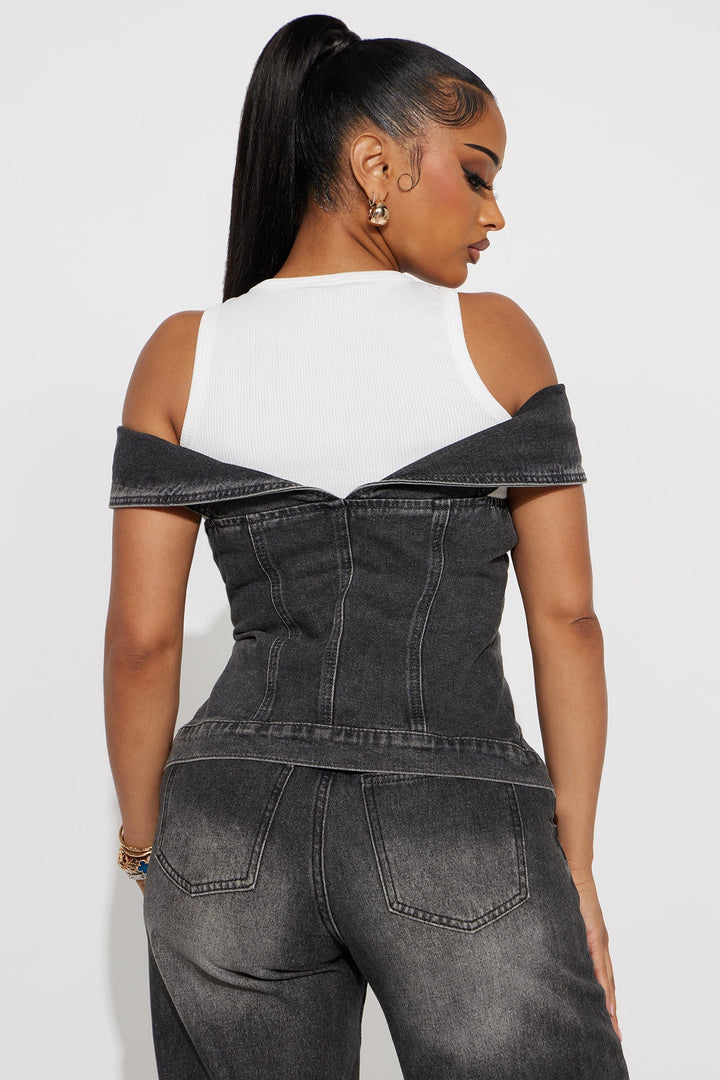 Available In Black/White. | Denim Top | Attached Ribbed Tank Top | Non Stretch | Button Front | Front Pockets | Disclaimer: Due To The Specialized Wash Process, Each Garment Is Unique. | Main: 81% Cotton 11% Rayon 8% Polyester | Lining: 96% Polyester 4% Spandex | Imported