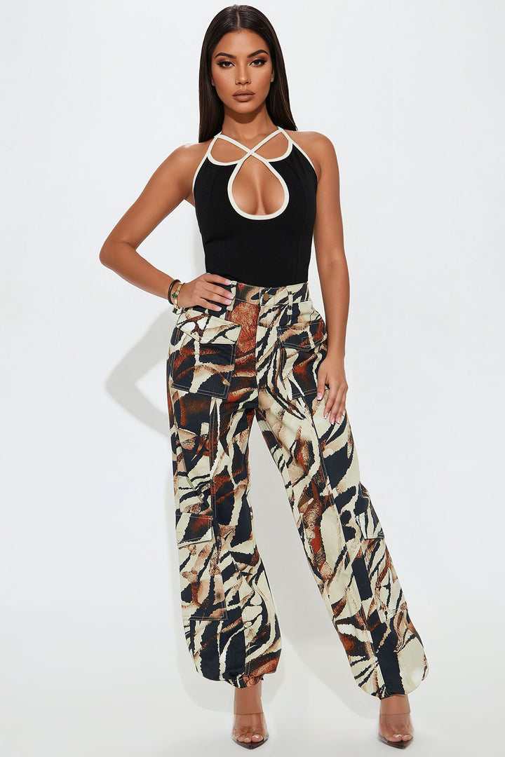 Available In Black/combo. | Bodysuit | Halter Tie Neck | Criss Cross Detail | Keyhole Cutout | Snap Button Closure | Stretch | Final Sale | 68% Rayon, 28% Nylon, 4% Spandex | Imported