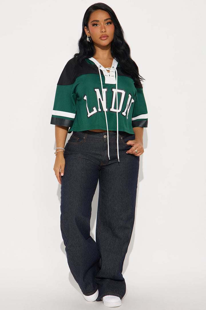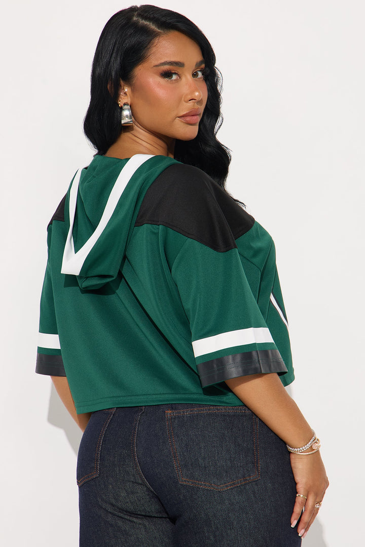 Available In Hunter Green. | Hoodie | Short Sleeve | Lace Up Detail | Stretch | Crop Top | Disclaimer: Due To The Printing Process A Difference In Saturation May Occur. Each Garment Is Unique | Self: 100% Polyester | Contrast: 100% Polyester | Imported
