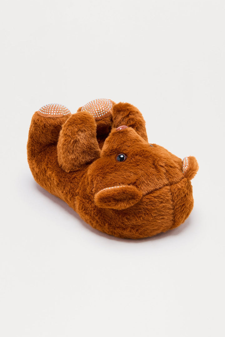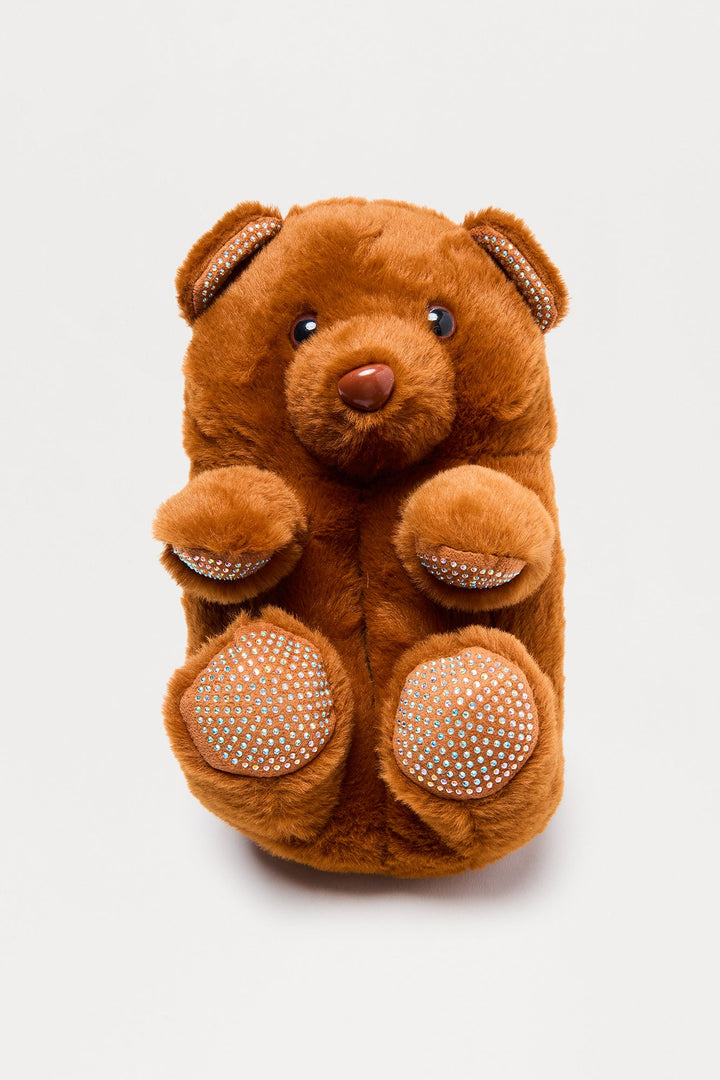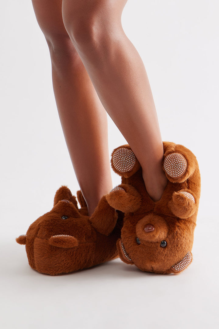 Lovey Rhinestone Bear Slippers - Brown