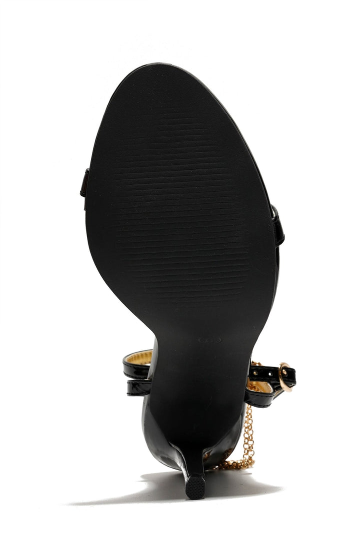 MABELLE - BLACK - HEELS by CAPE ROBBIN Stiletto heel: 4.5-inch Ankle strap PU leather insole with memory foam for added comfort Golden chain detail with lock Round toe Step into bold fashion with the Mabelle Ankle Strap Stiletto Heeled Sandals with Chain details. These heels are adorned with golden chain embellishments that drape elegantly around the ankles, adding a unique and stylish twist. Designed for those who aren't afraid to make a statement. These striking heels blend classic glamour with edgy details, perfect for adding a touch of drama to any outfit.