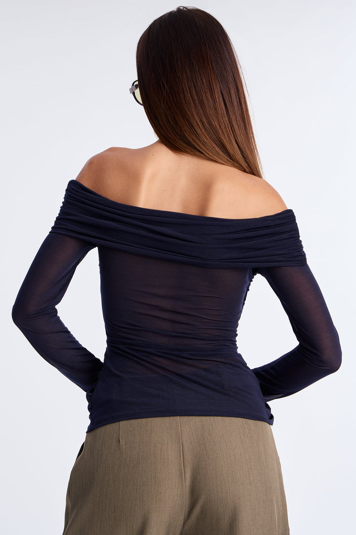 Available In Navy. | Top | Off Shoulder | Long Sleeve | Ruched | Stretch | Self: 100% Polyester | Imported