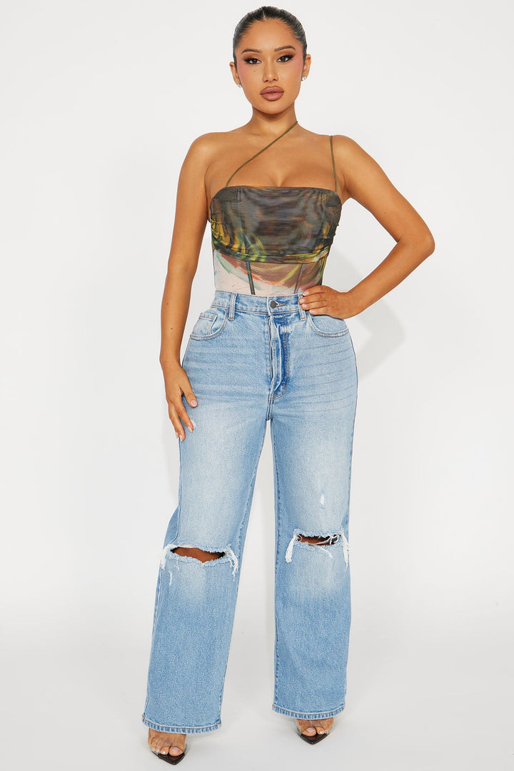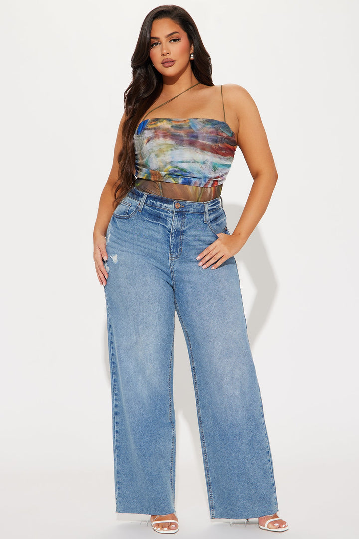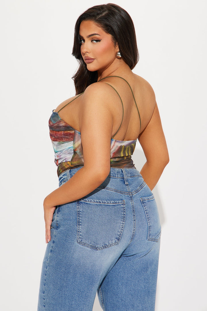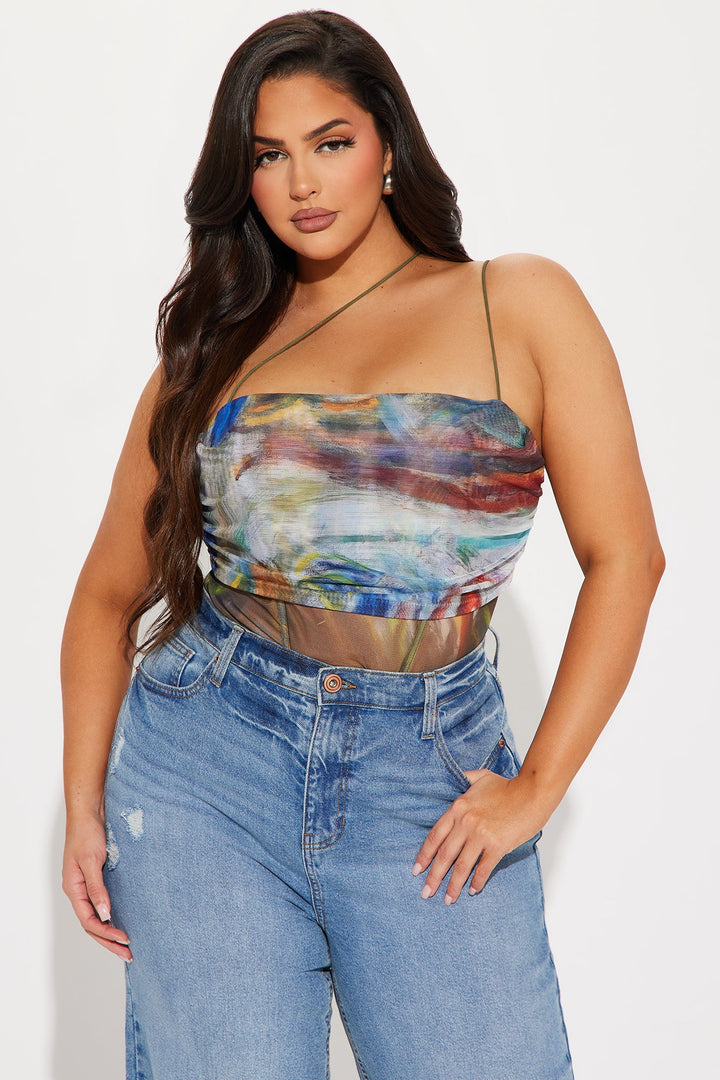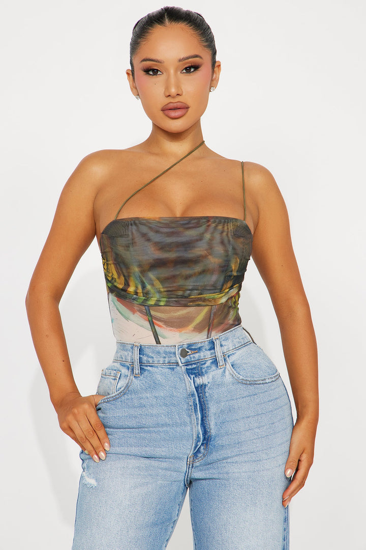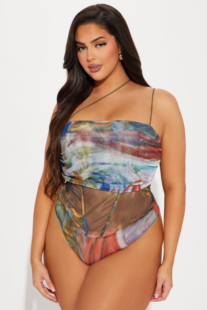 Bodysuit | One Shoulder | Spaghetti Strap | Ruched Detail | Boning | Abstract Print | Cheeky Bottom | Snap Button Closure | ouble Lined | Mesh | Stretch | Final Sale | SELF 93% Polyester 7% Spandex | LINING 95% polyester 5% spandex | Imported