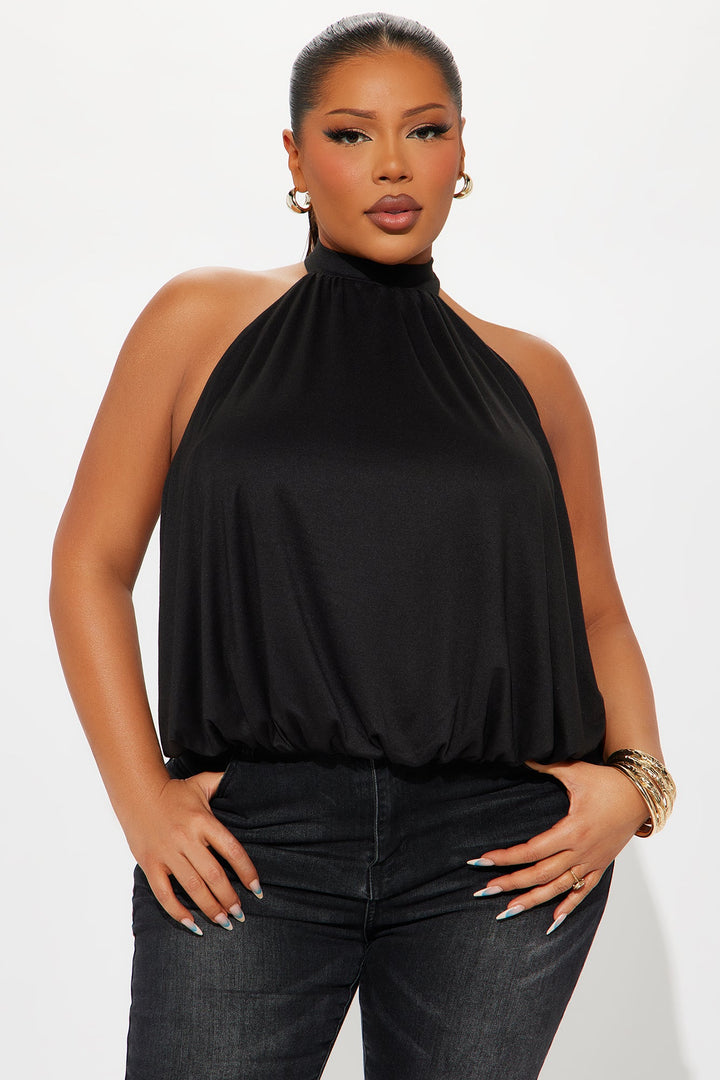 Available In Black, Brick Red, Sand And Teal. | Halter Top | Stretch | Tie Neck | Turtle Neck | Ruched | Bubble Hem | Double Lined | 95% Polyester 5% Spandex | Imported