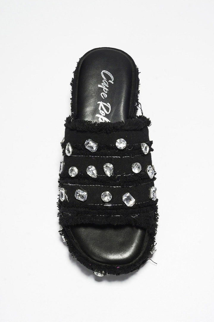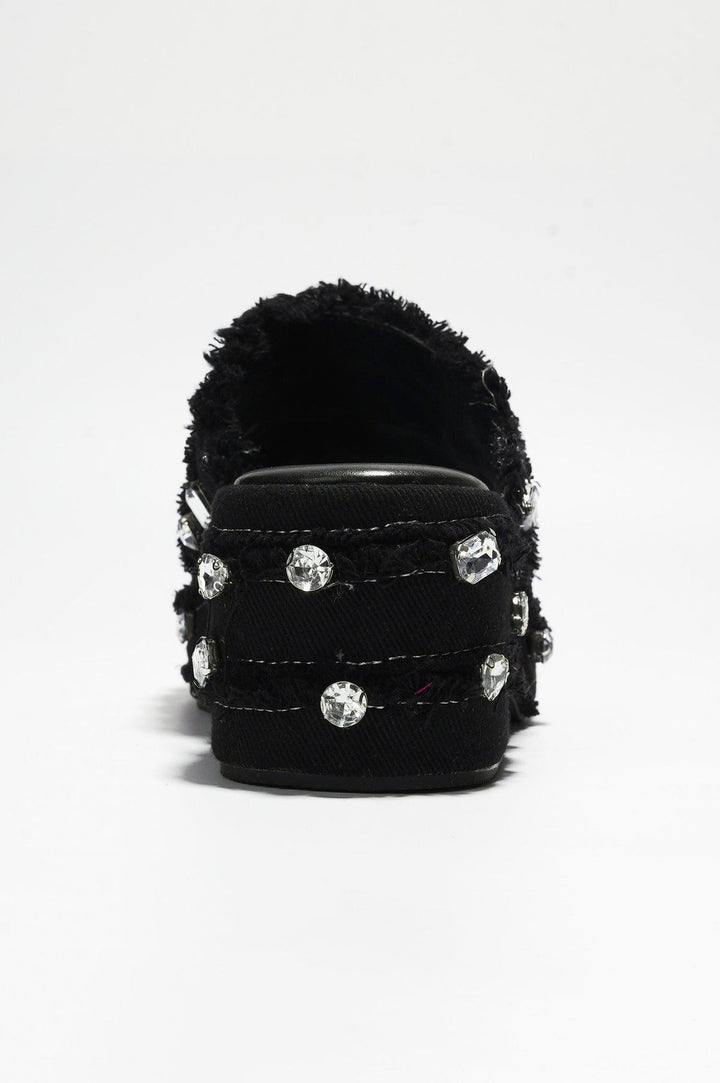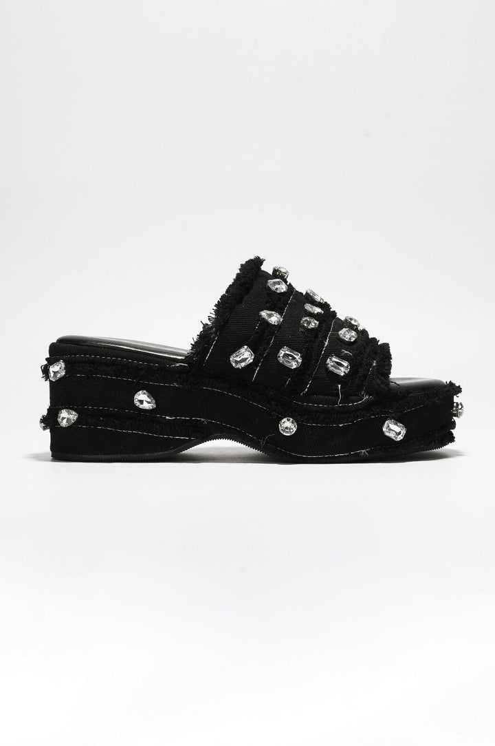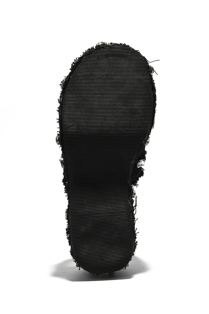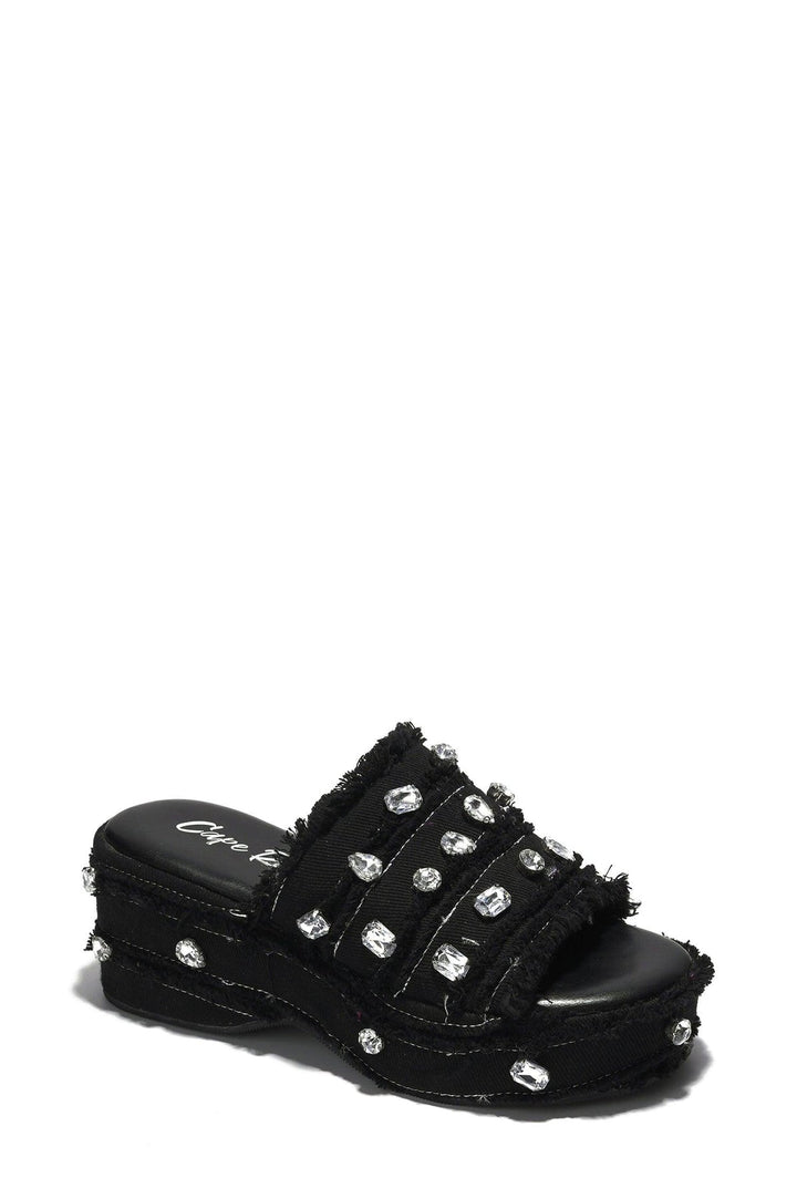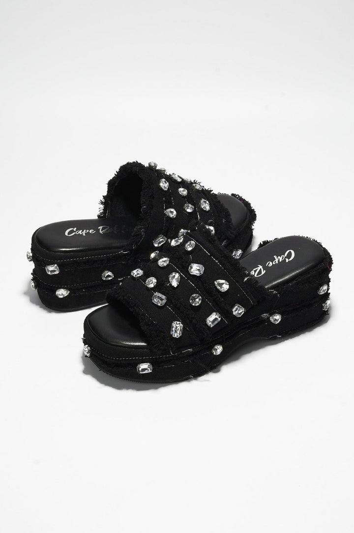 MAGNOLLIA - BLACK - SANDALS by CAPE ROBBIN Heel: 2 inch Slip-on PU leather insole with memory foam for added comfort Rhinestone embellished Round toe Elevate your summer look with these stunning platform sandals. The raw hem denim upper adds a touch of edgy style,while the rhinestone embellishments give them a glamorous twist. The platform design not only adds height but also ensures all-day comfort. Whether you're heading to a festival or a night out with friends,the Magnollia sandals will make a fashion statement.