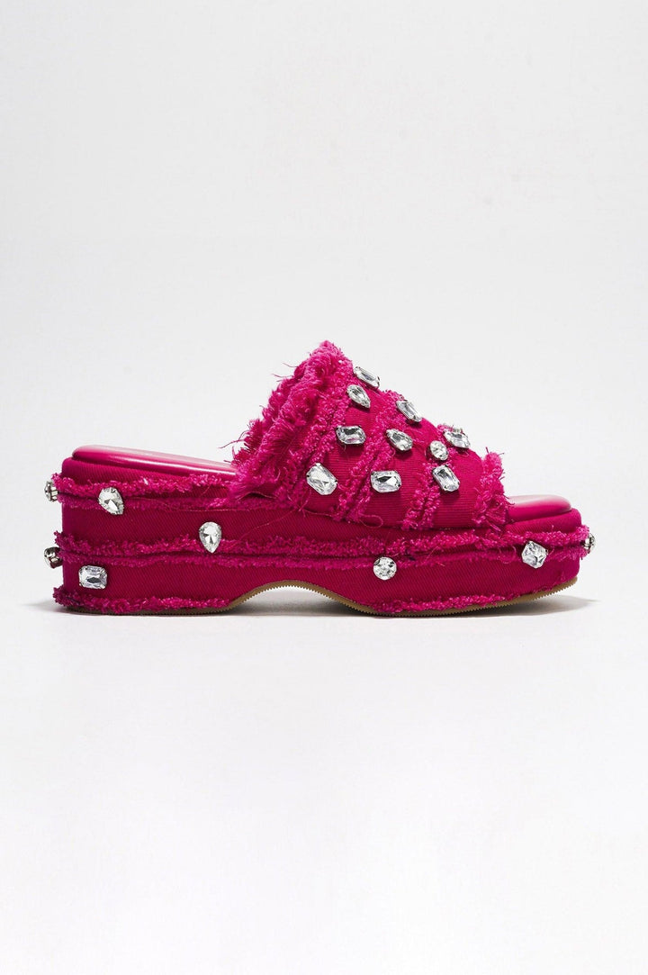 MAGNOLLIA - PINK - SANDALS by CAPE ROBBIN Heel: 2 inch Slip-on PU leather insole with memory foam for added comfort Rhinestone embellished Round toe Elevate your summer look with these stunning platform sandals. The raw hem denim upper adds a touch of edgy style,while the rhinestone embellishments give them a glamorous twist. The platform design not only adds height but also ensures all-day comfort. Whether you're heading to a festival or a night out with friends,the Magnollia sandals will make a fashion statement.
