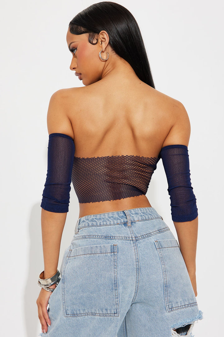 Available In Navy And Orange. | Crop Top | Off Shoulder | Mesh Back | Stretch | Disclaimer: Due To The Printing Process A Difference In Saturation May Occur. Each Garment Is Unique. | Self: 95% Polyester 5% Spandex | Contrast: 90% Polyester 10% Spandex | Imported