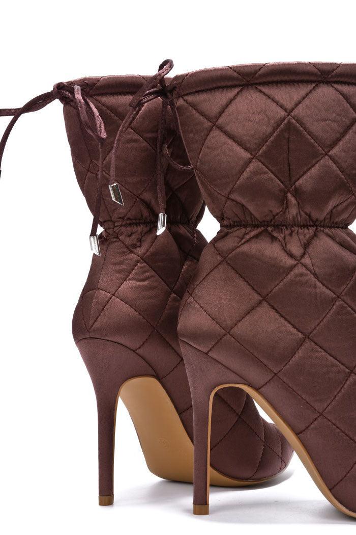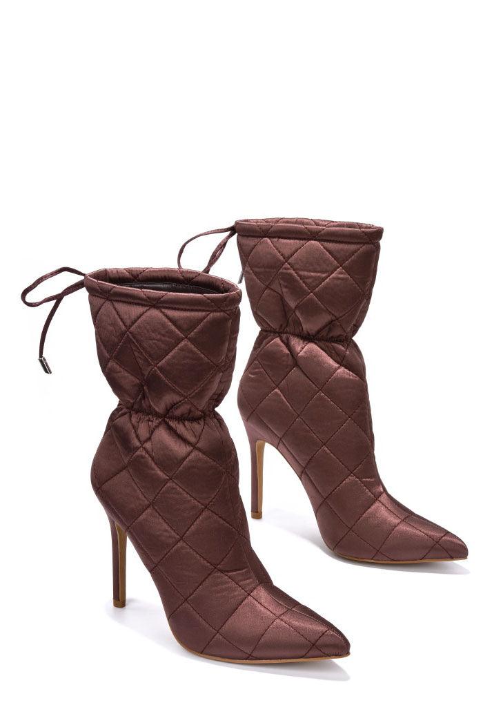 MAKAYLA - BROWN - BOOTIES by CAPE ROBBIN pointy toe skinny high heels metallic sheen elastic Makayla's skinny high heels are chic,sophisticated,and perfect for any occasion. Featuring an eye-catching metallic sheen and elastic straps for a secure and comfortable fit. Available in nude,brown,and black.