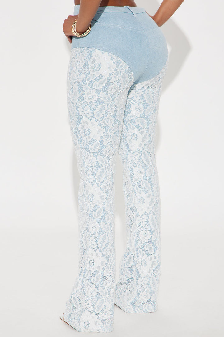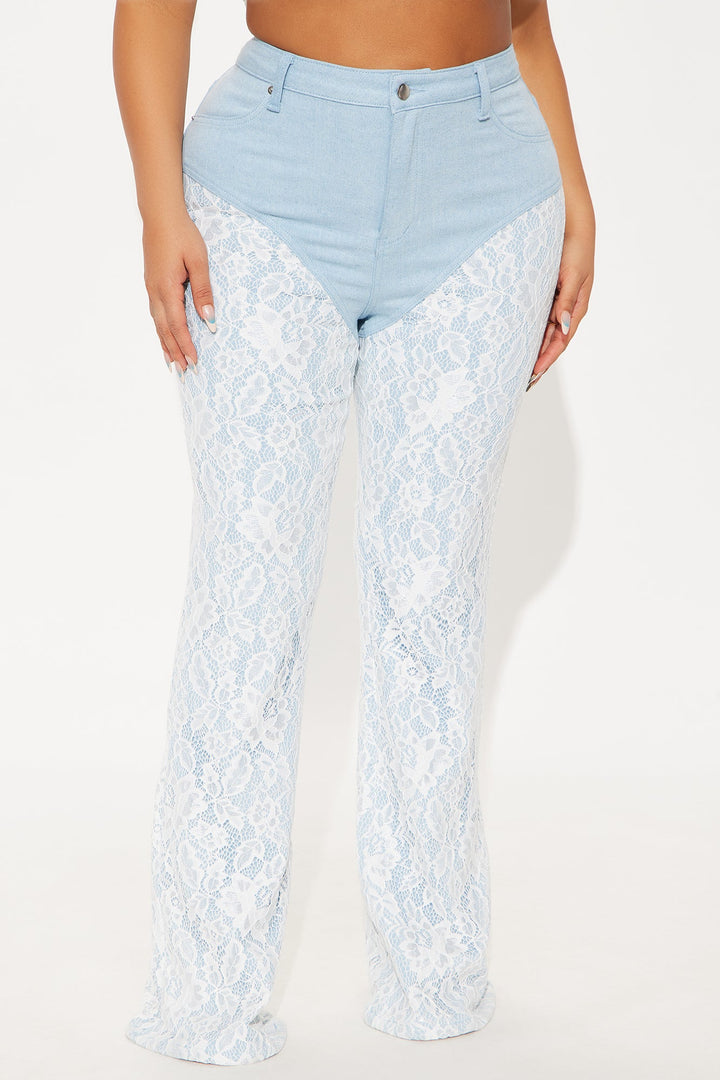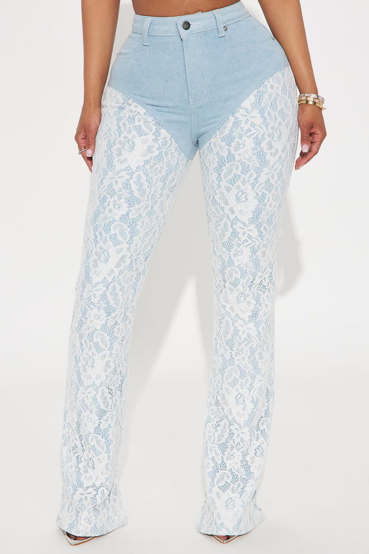 Available In Light Wash. | Flare Jean | Faux Pockets | 11" High Rise | 34" Inseam | Medium Stretch | Lace Details | Disclaimer: To Keep The Aesthetic Of This Garment, Please Follow The Care Instructions Carefully. | Disclaimer: Due To The Specialized Wash Process, Each Garment Is Unique. | Main: 78% Cotton 20% Viscose 2% Spandex | Lace: 88% Polyamide 12% Spandex | Imported