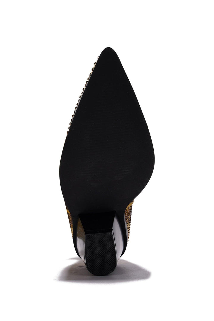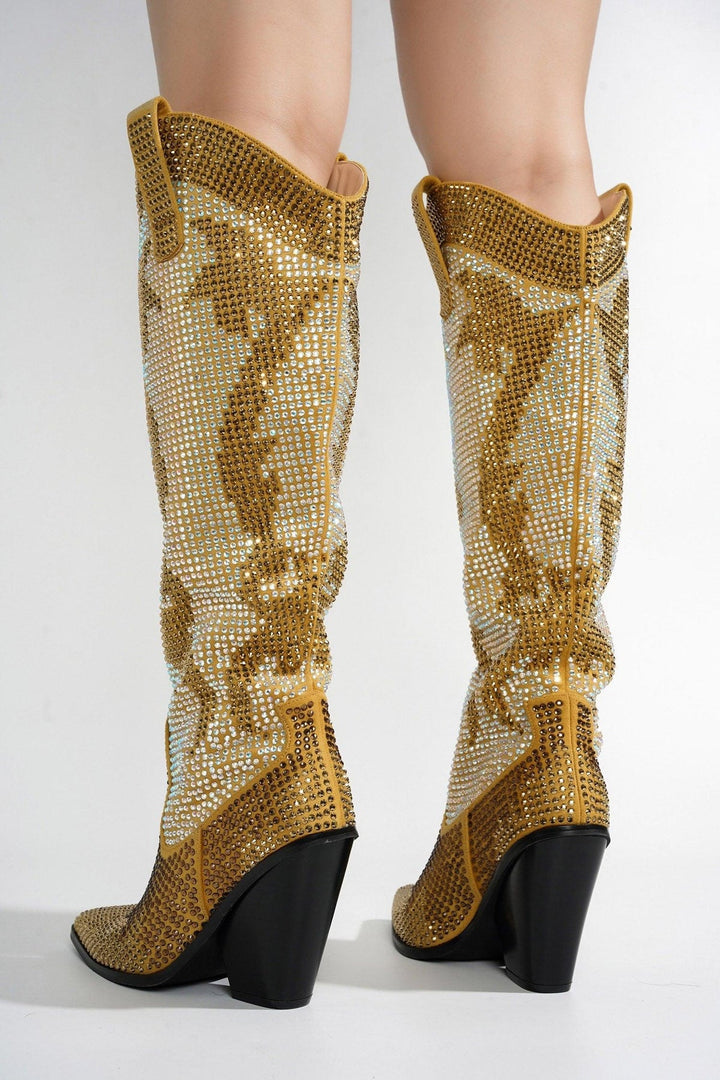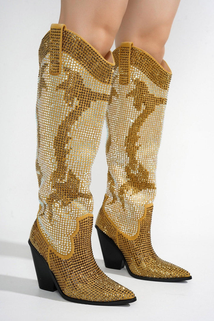 MALINDE - GOLD - BOOTIES by CAPE ROBBIN Closed Point Toe 3.5 Inch Western Block Heel Rhinestone Embellished Rubber Outsole The Malinde boots is your ticket to timeless fashion with a touch of dazzle and a dash of the Wild West. With their eye-catching rhinestone embellishments and knee-high design,they are the perfect choice to elevate your style and make a memorable impression. Step into a world of timeless fashion with these boots and let your inner cowgirl shine.
