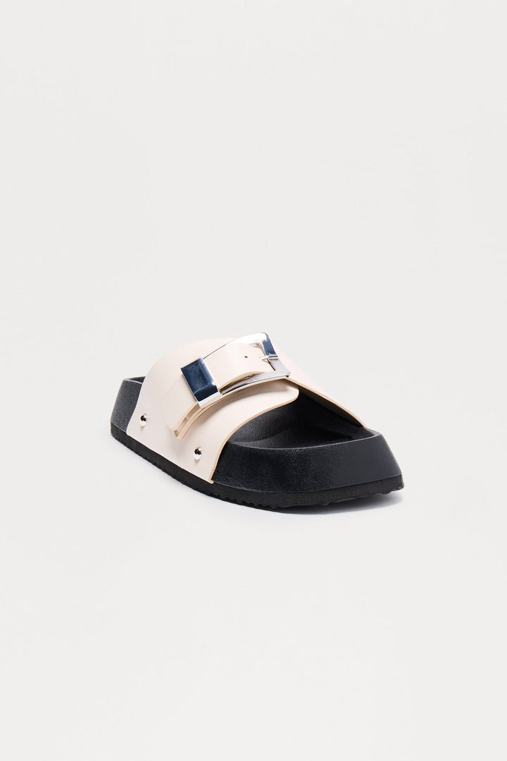 Available In White. | Flat Sandals | Buckle Detail | Square Toe | Flat Heel | Imported