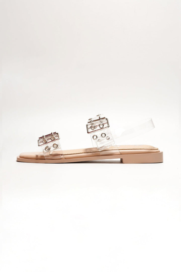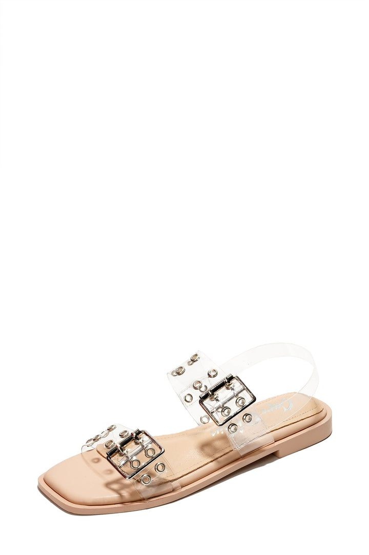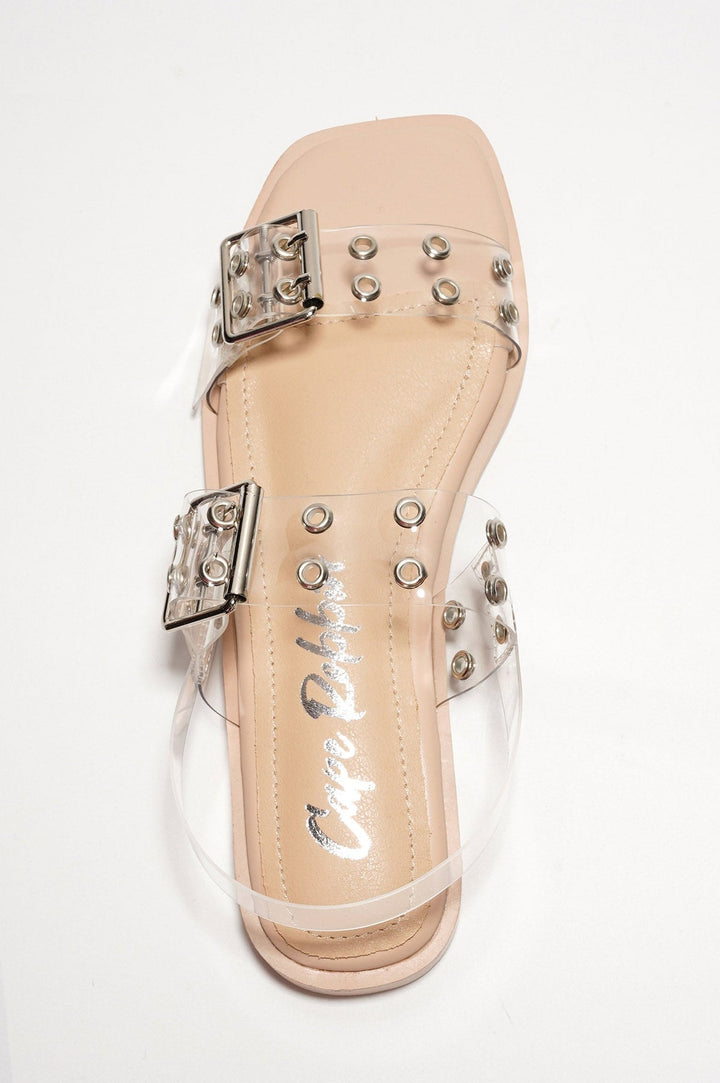 MARA - CLEAR - SANDALS by CAPE ROBBIN Heel height: 0.5-inch Slingback with double buckle closure Memory foam insole for added comfort Square toe Meet the Mara Buckle Slingback Sandals, the perfect combination of edgy and chic for the modern fashionista. Available in striking red, playful leopard print, and versatile clear, these sandals feature double buckle straps adorned with eyelet details. Perfect for both casual and dressy occasions, these sandals effortlessly complement dresses, skirts, and tailored pants, adding a touch of edginess to any outfit. Whether you're heading to a brunch with friends, a casual day out, or a night on the town, these sandals will ensure you step out in style.