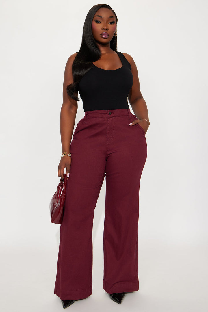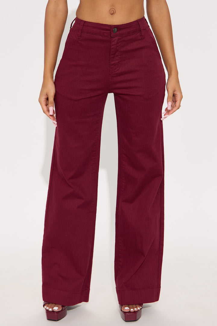 Available In Brown And Burgundy. | Wide Leg Jean | Trouser Pockets | Dart Detail | 33" Inseam | 11" High Rise | Medium Stretch | Disclaimer Due To The Specialized Wash Process, Each Garment Is Unique. | 98% Cotton 2% Spandex | Imported