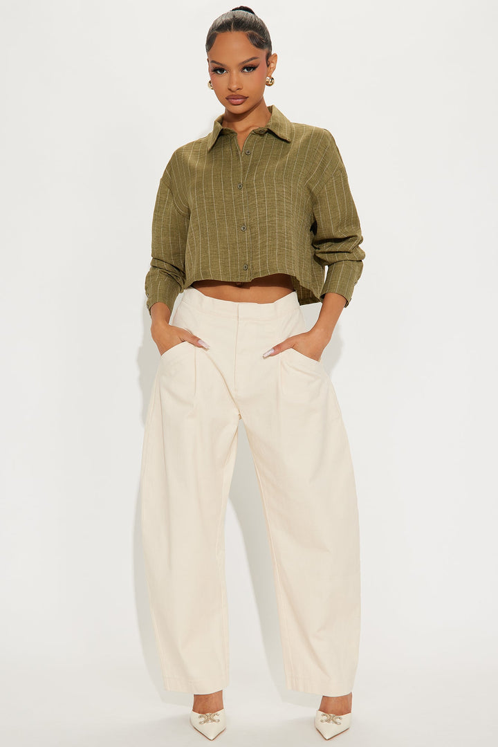 Available In Natural And Olive. | Cropped Pinstripe Shirt | Button Front | Shell: 97% Polyester 3% Viscose | Imported