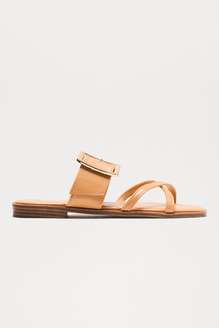 Available In Black, Tan And White. | Flat Sandals | Buckle Detail | Square Toe | Flat Heel | Imported
