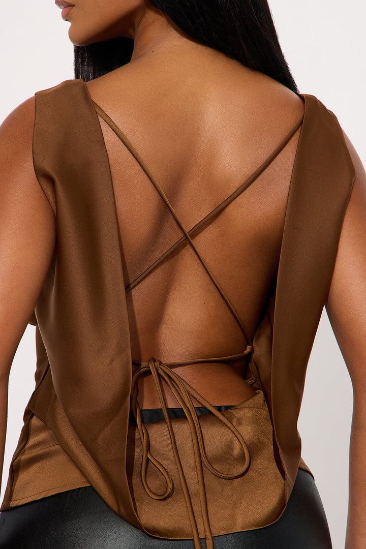 Available In Brown And Yellow. | Satin Blouse | Cowl Neck | Lace Up Back | Non Stretch | Self: 97% Polyester 3% Spandex | Imported