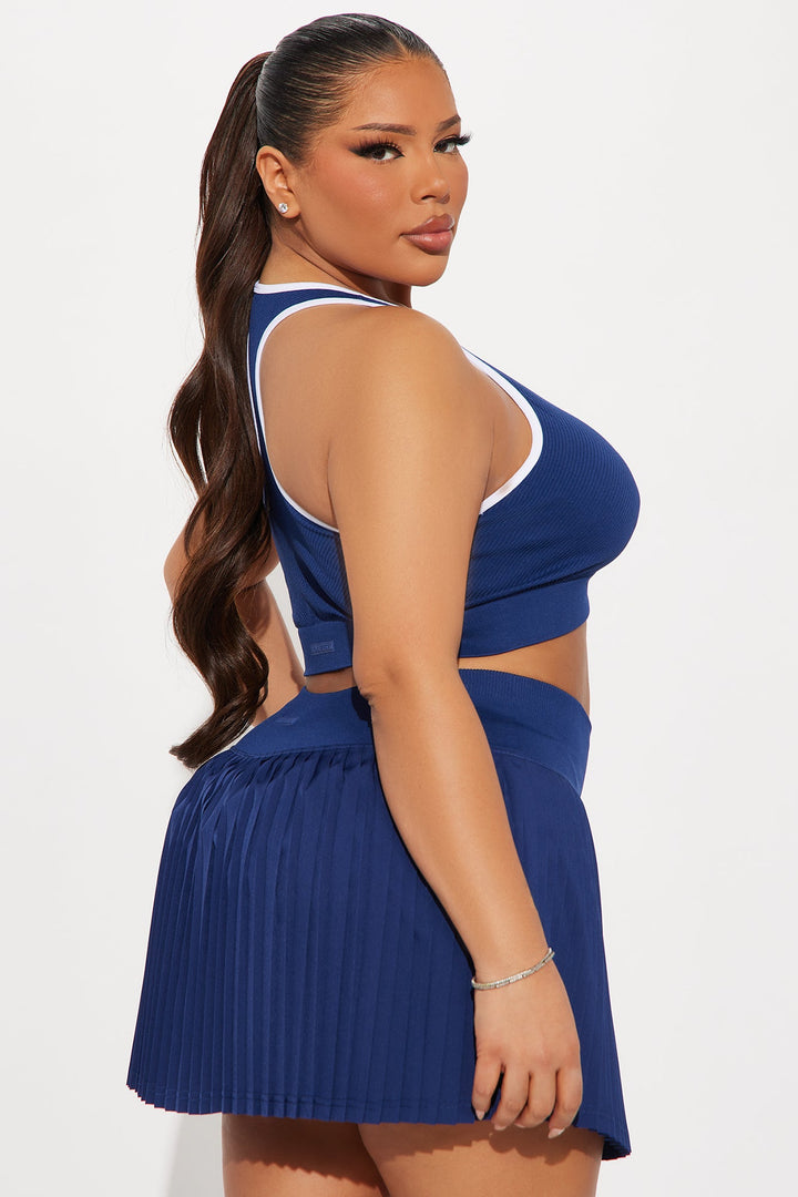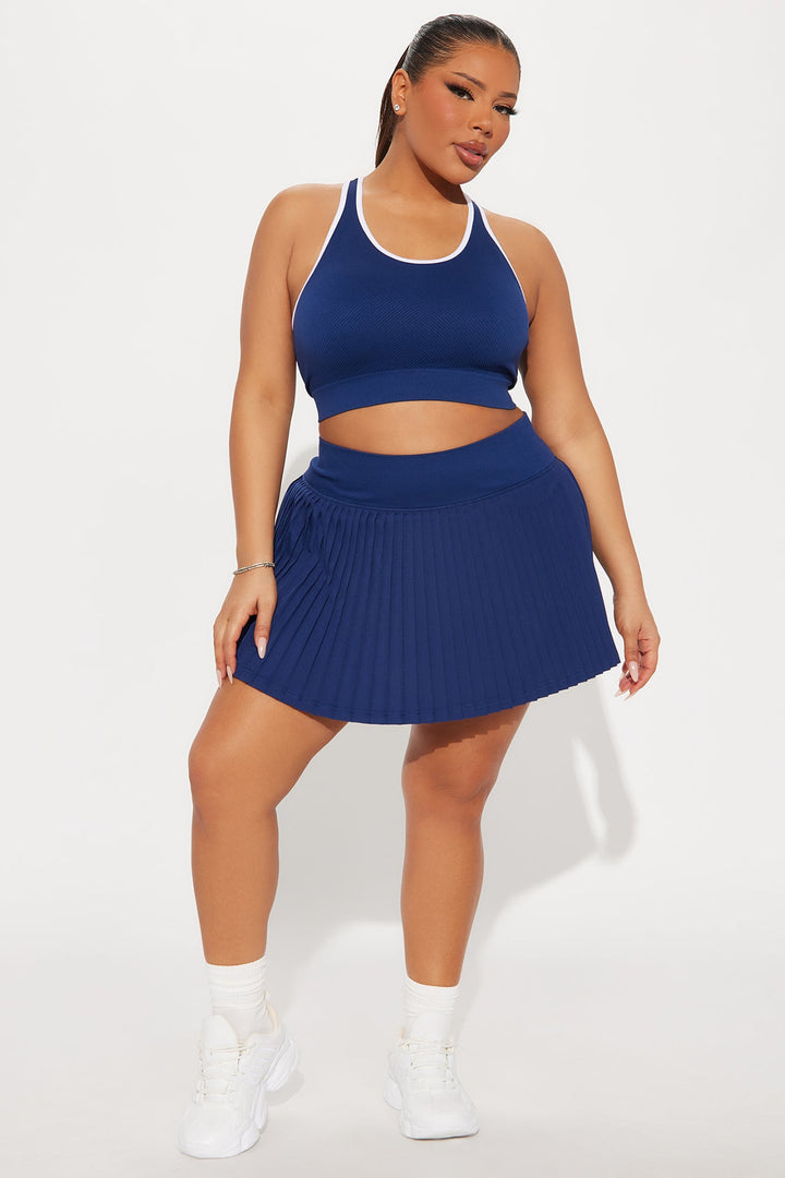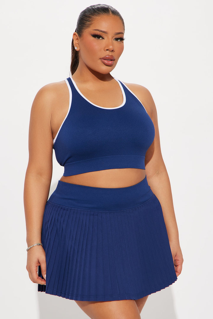 Available In Midnight Blue. | Sports Bra | Scoop Neck | Sleeveless | Seamless Ribbed | Contrast Trim | Medium Impact | Stretch | Pair With "Match Point Active Skirt" | 92% Nylon 8% Elastane | Imported