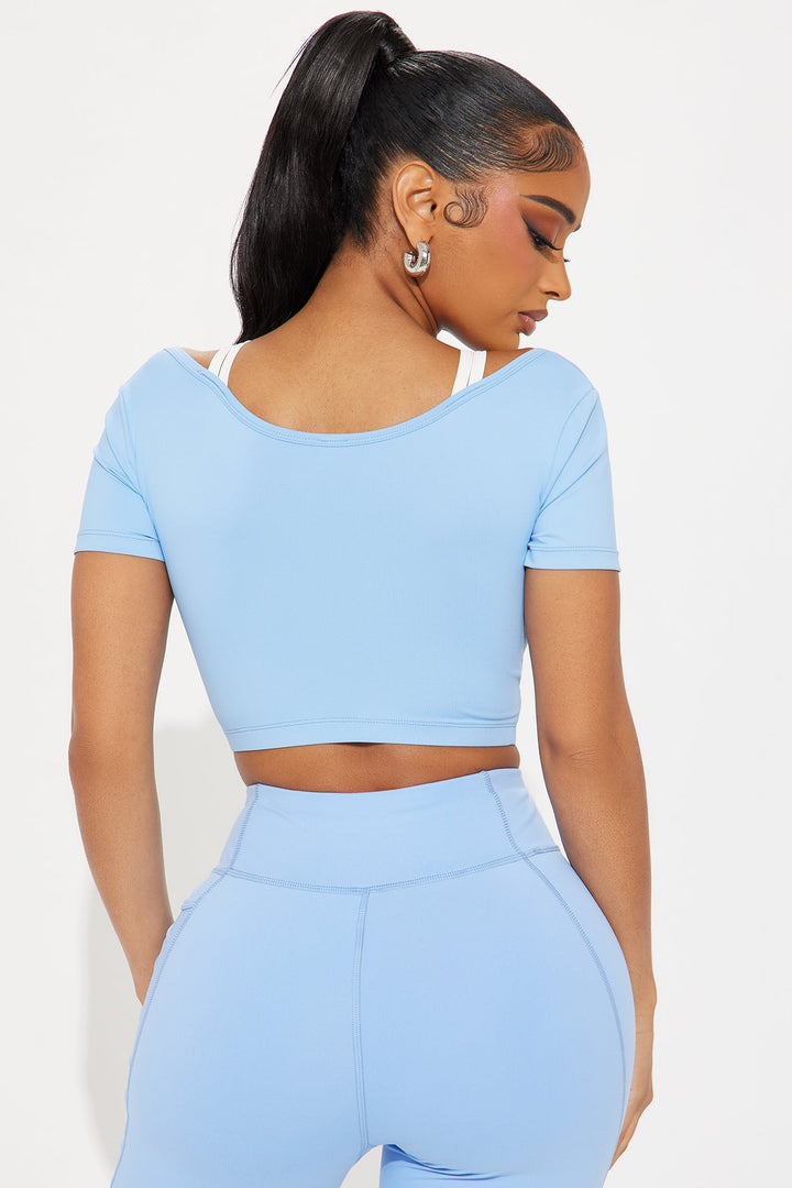Available In Kelly Green And Light Blue. | Active Top | Scoop Neck | Short Sleeve | Compression | Colorblock | Twofer Detail | Low Impact | Stretch | Pair With "Match Point Active Legging" | 84% Polyester 16% Spandex | Imported
