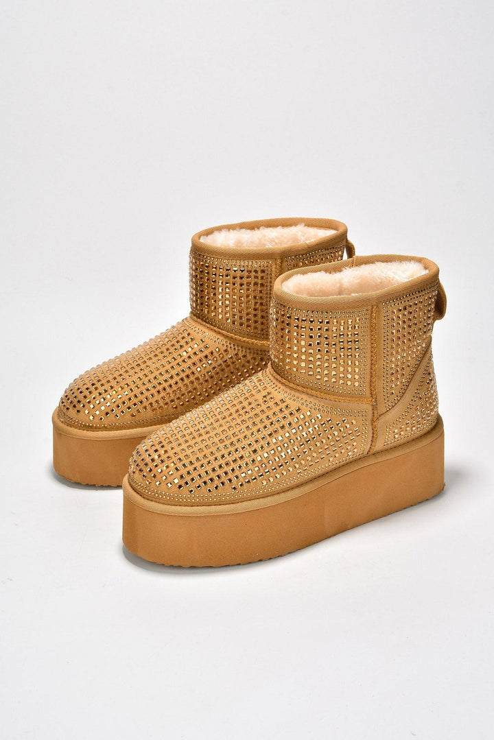 MAXBE - CAMEL - BOOTIES by CAPE ROBBIN rhinestone embellished fur trim flat platform ankle booties suede finish These fur-lined booties are like walking on clouds but with a drizzle of attitude. The platform adds height for a gorgeous look. Comes in black and camel.