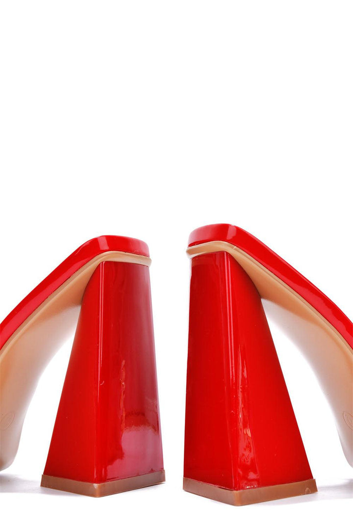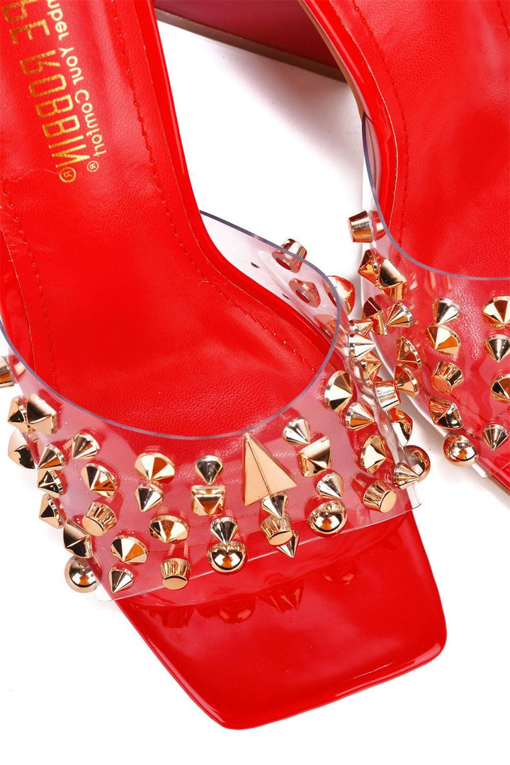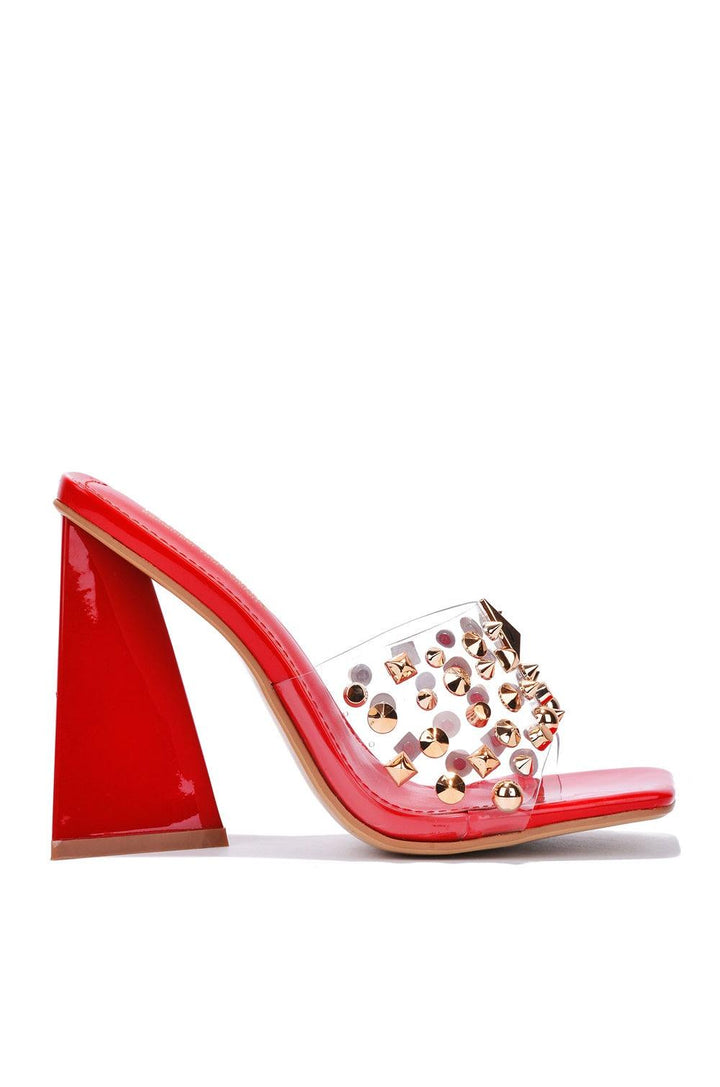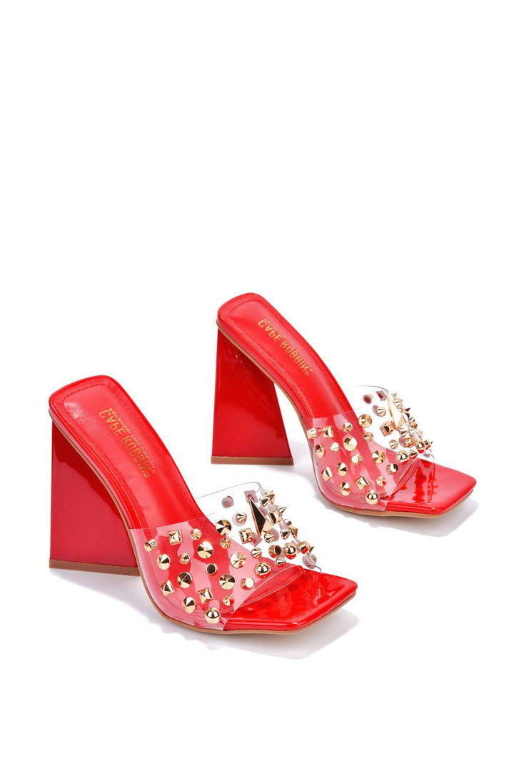 MAXFIELD - RED - HEELS by CAPE ROBBIN open square toe 3.5 inch heel PU spikes and studs TPU lightly cushioned footbed rubber outsole Cape Robbin's Maxfield delivers an elevating,one-of-a-kind look that takes your outfit to another level. Features a geometric heel and a shimmering trim. You'll definitely be the talk of the night in a positive way.