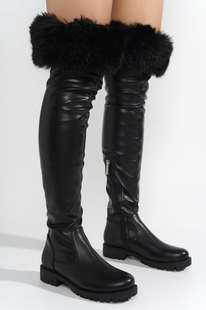 MEGHANI - BLACK - BOOTS by CAPE ROBBIN closed round toe fur trim PU rubber outsole lightly cushioned footbed Meghani Fur-lined thigh-high boots are the trendiest shoes this season! They're cold and snow-ready,and you'll walk with confidence.