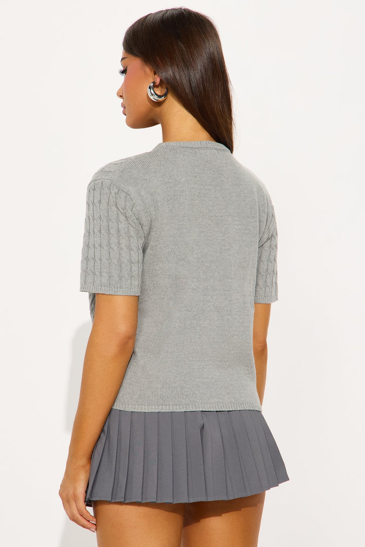 Available In Chestnut And Heather Grey. | Pullover Sweater | Short Sleeves | Cable Knit | 60% Cotton 40% Acrylic | Imported