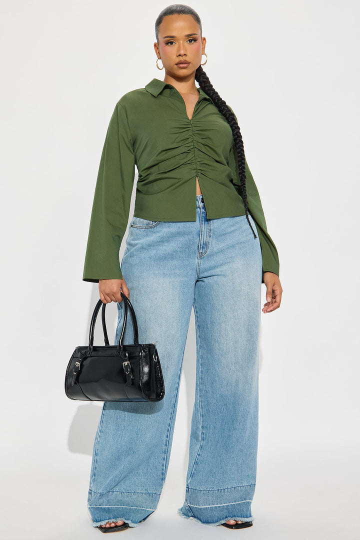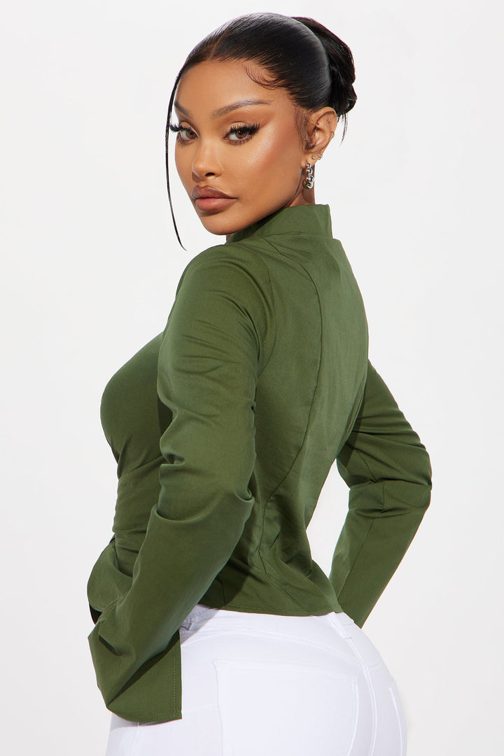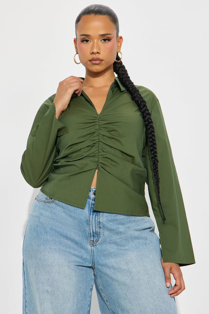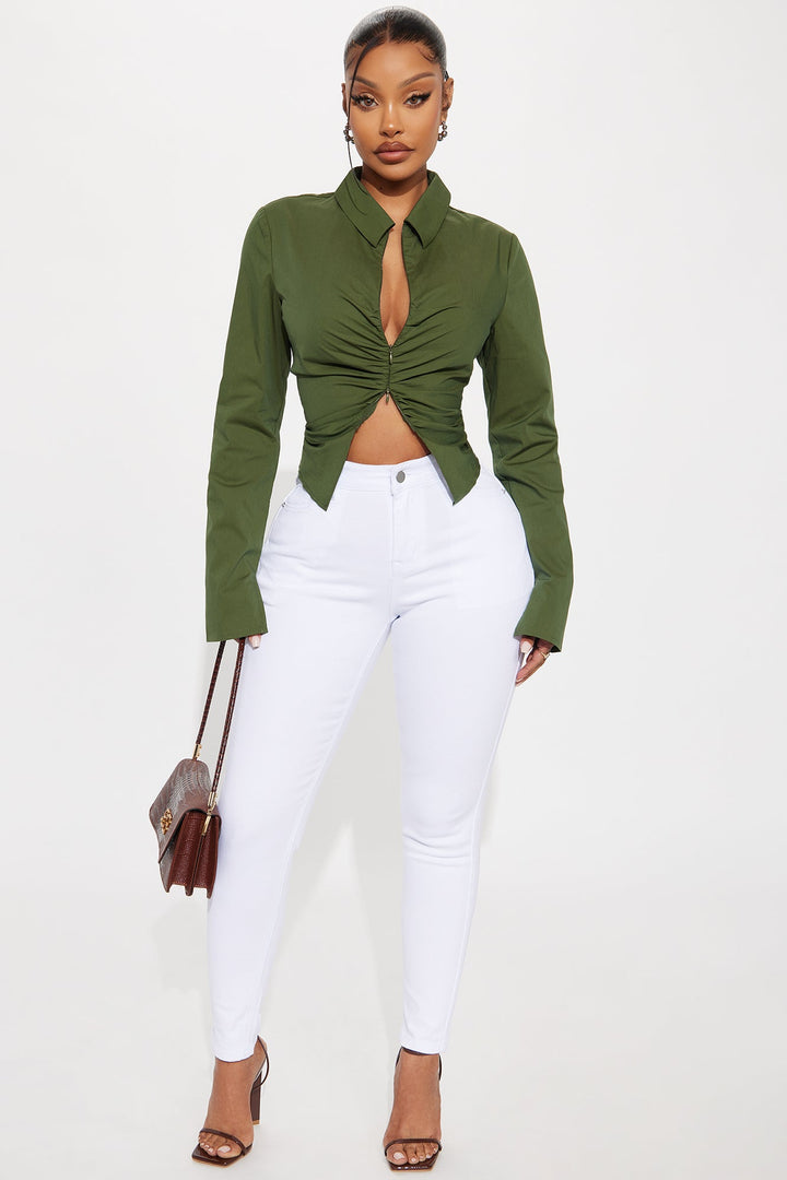 Available In Black, Dark Olive And White. | Poplin Shirt | Ruched Detail | Front Zip Closure | 70% Cotton 27% Nylon 3% Spandex | Imported