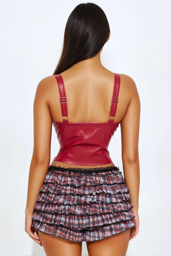 Available In Red. | Faux Leather Top | Stretch | Adjustable Straps | Cut Out | Seaming | Side Zipper | Cropped | Self: 40% Cotton 30% Polyurethane 30% Acrylic | Lining: 100% Polyester | Imported