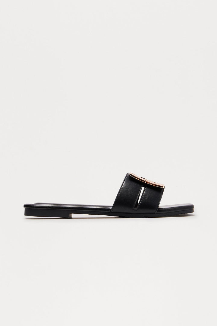 Available In Black, Tan And White. | Flat Sandals | Hardware Detail | Square Toe | Flat Heel | Imported