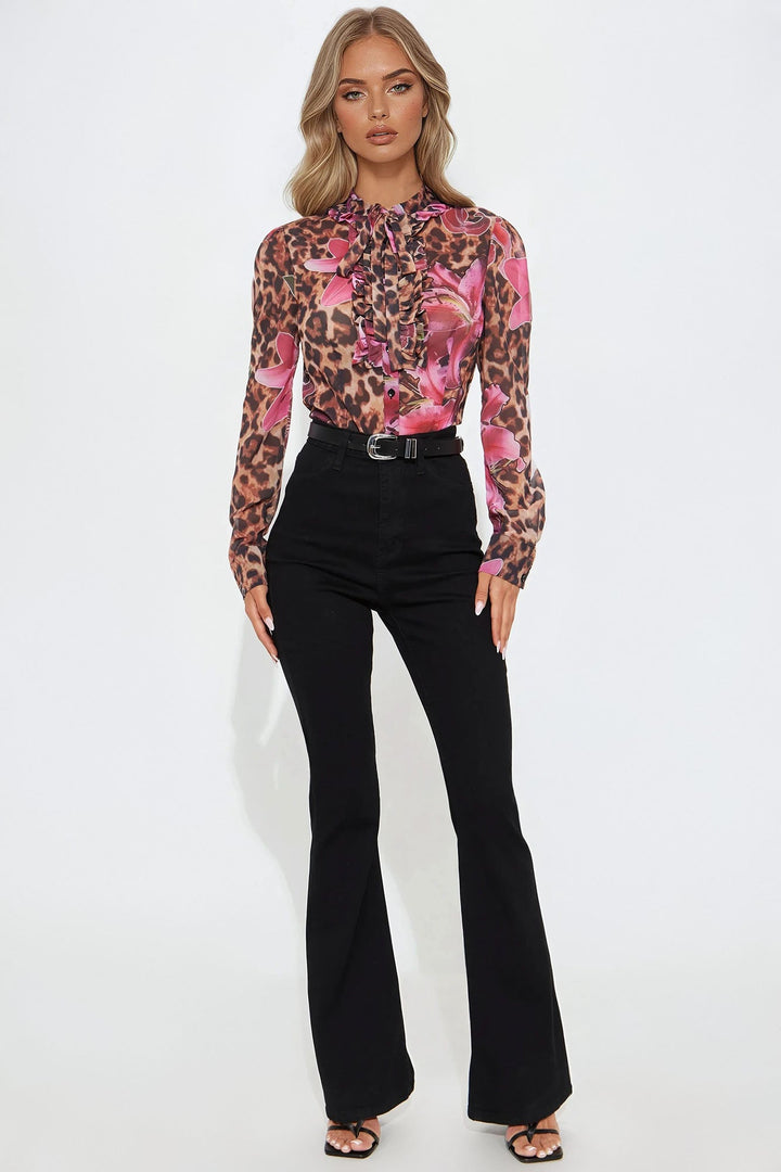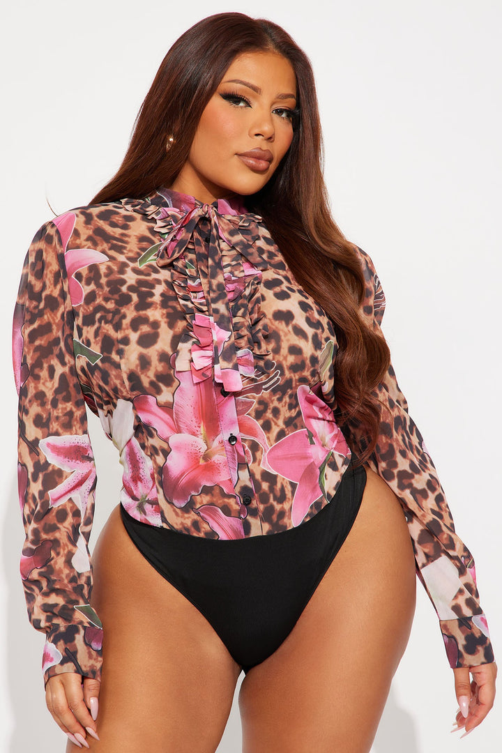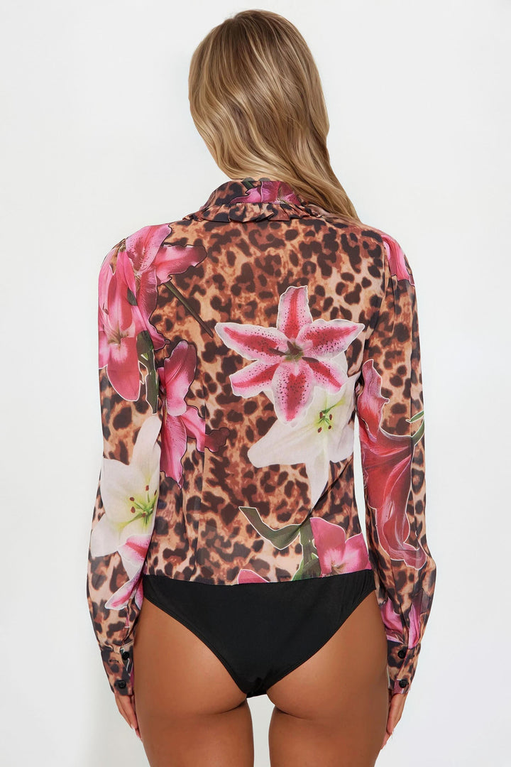 Mishelle Chiffon Floral Leopard Bodysuit - Brown/combo