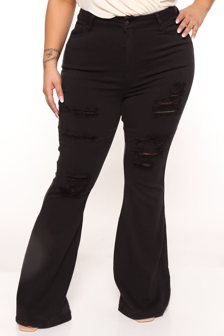 Available In Black. | Flare Jean | Stretch Denim | Distressed | 5 Pocket | 34" Inseam | 11" High Rise | 23.5" Leg OpeningDisclaimer: Due To The Distressing Process, Each Garment Is Unique | 59% Cotton 33% Tencel Lyocell 6% T400 2% Lycra Spandex | Imported