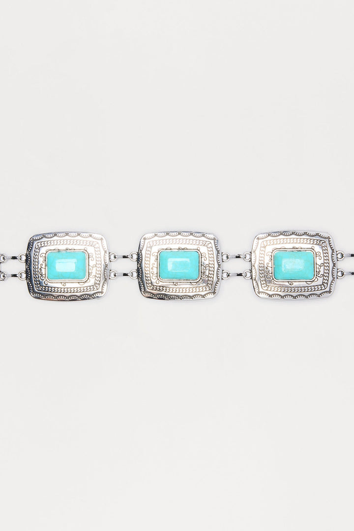 Available In Silver/Black And Silver/Blue. | Chain Belt | Rectangle Concho Design | Jeweled Detail | Lobster Clasp Closure | Length: 46" | Imported