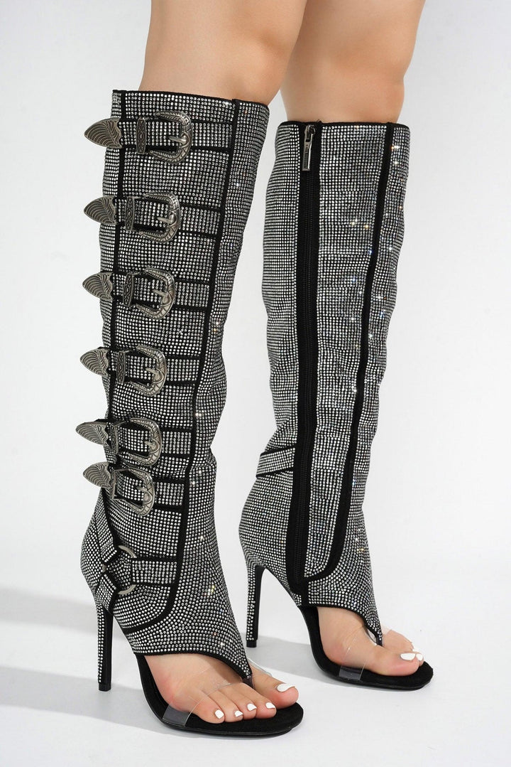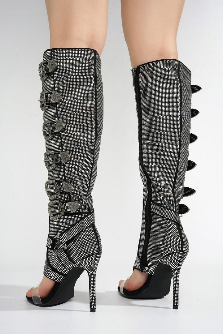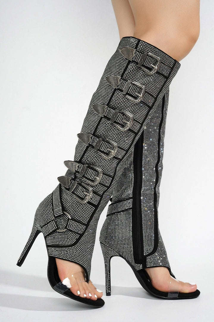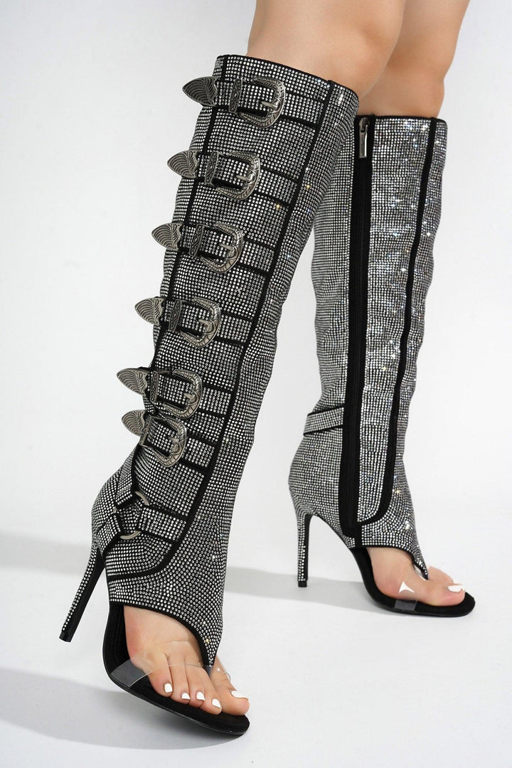 MOTO MAMI - SILVER - BOOTS by CAPE ROBBIN 4 Inch Heel Rhinestone Coated Open Round Toe Buckle Trim Elevate your style with these statement-making boots that seamlessly blend moto-inspired grit with glamorous flair. Step out in confidence,exuding attitude and allure with every stride,making them the ultimate choice for trendsetters and fashionistas alike.