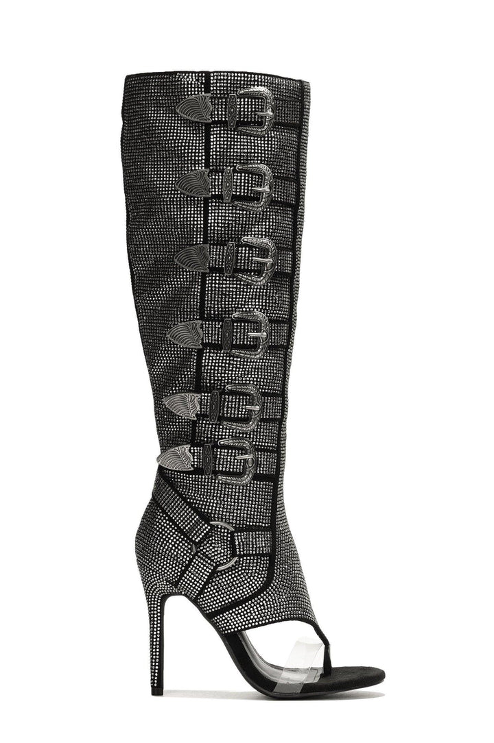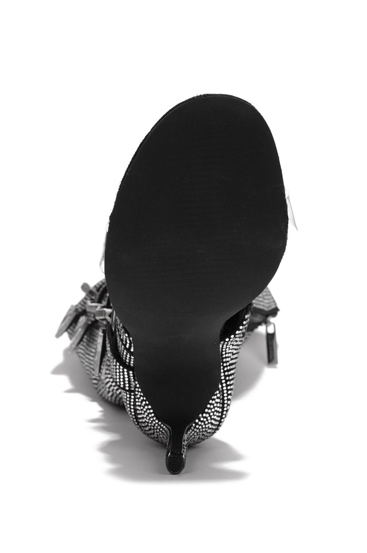 MOTO MAMI - SILVER - BOOTS by CAPE ROBBIN 4 Inch Heel Rhinestone Coated Open Round Toe Buckle Trim Elevate your style with these statement-making boots that seamlessly blend moto-inspired grit with glamorous flair. Step out in confidence,exuding attitude and allure with every stride,making them the ultimate choice for trendsetters and fashionistas alike.