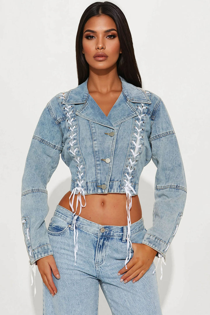 Available In Light Wash. | Denim Jacket | Lapel Collar | Long Sleeve | Denim | Lace Up Detail | Seaming Detail | Zipper Detail | Non Lined | DisclaimerDue To The Specialized Wash, Each Garment Is Unique. | Shell: 85% Cotton 15% Polyester | Imported
